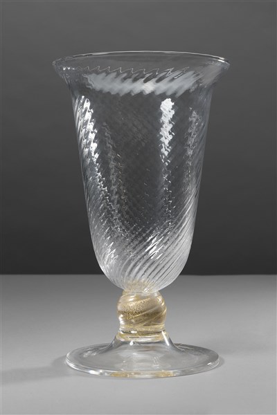 Vaso in cristallo con superficie a costolature spiraliformi e base applicata con inclusionei di foglia d'oro. Italia anni 90/2000