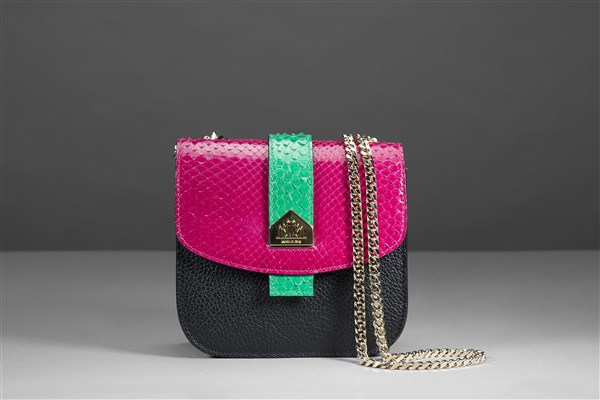 Borsetta a tracolla in pelle nera con patella in pelle di serpente fucsia e verde smeraldo (cm 15)