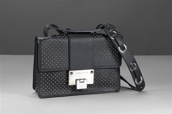 JIMMY CHOO Tracollina in pelle nera con patella frontale e chiusura logata in m