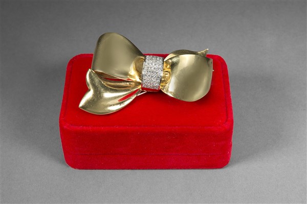 Spilla in oro giallo a fiocco con diamanti per complessivi ct. 2 circa, g. 42,5