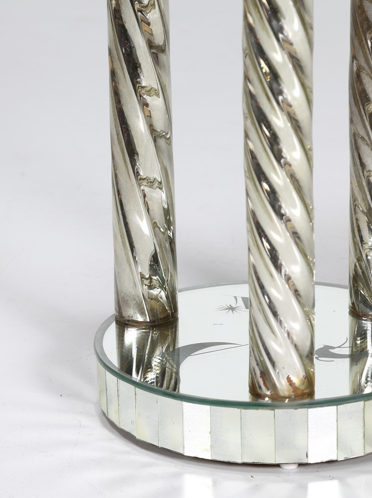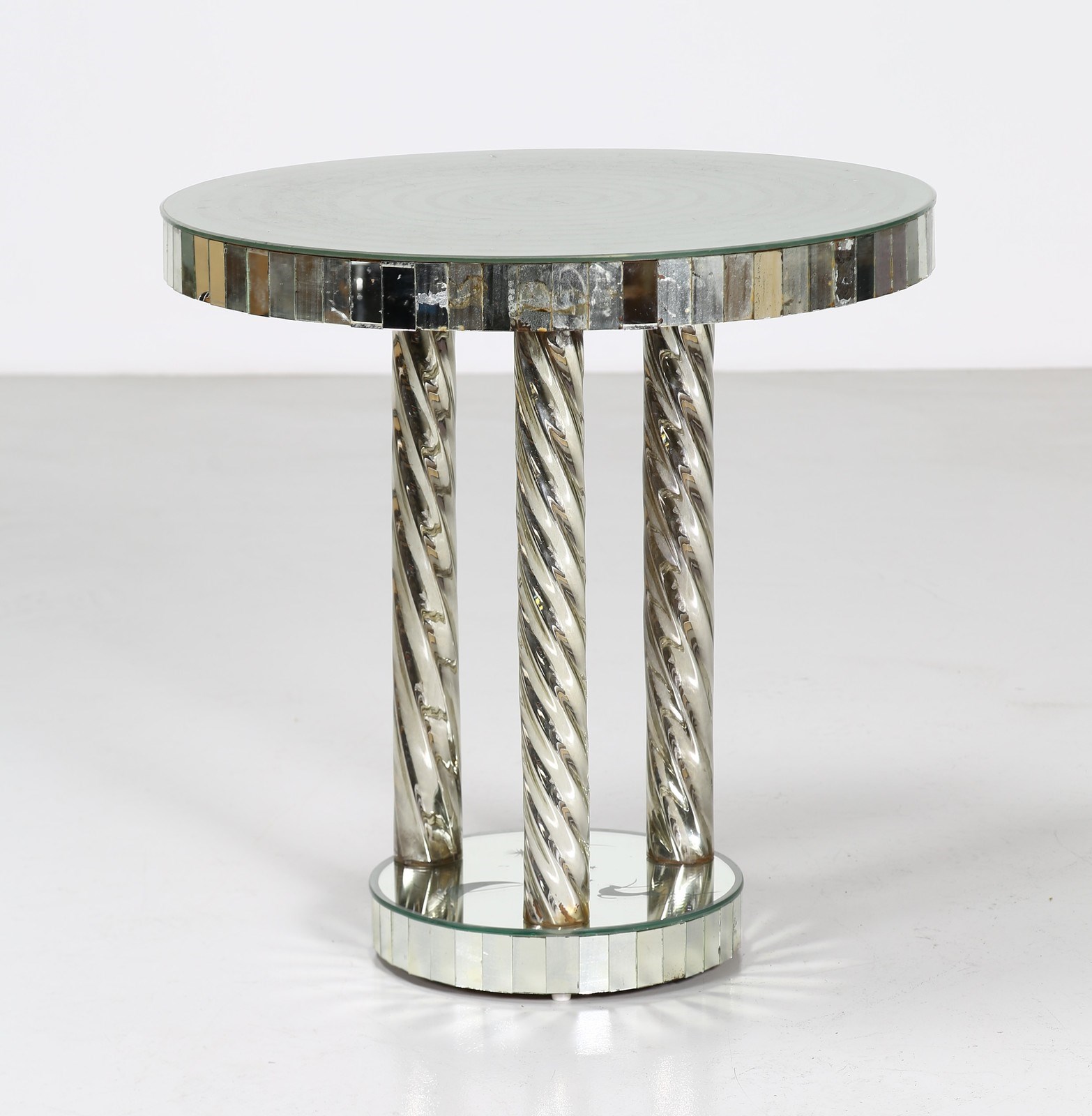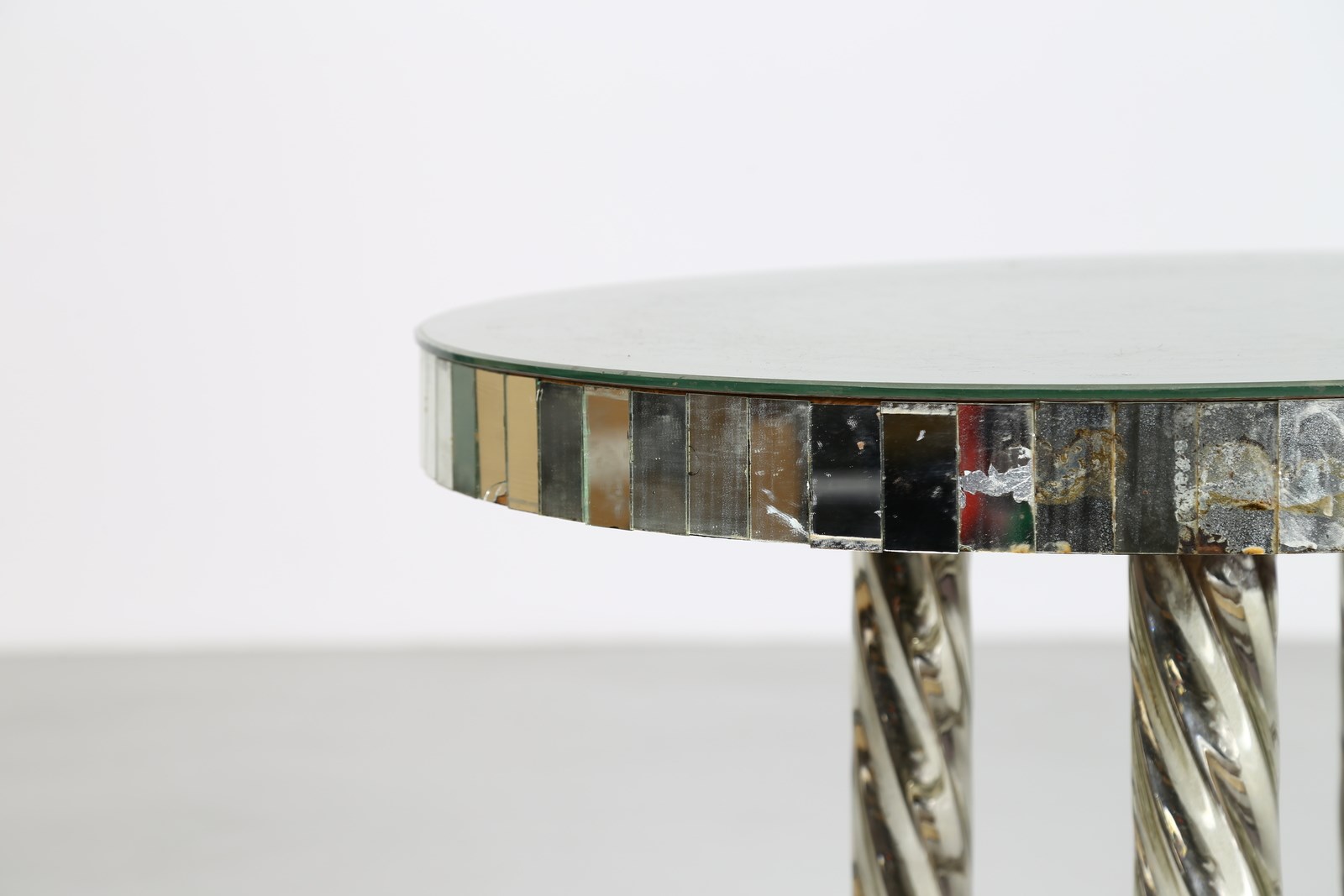 BRUSOTTI LUIGI Tavolo. Specchio, vetro.. Cm 70,00 x 70,00. Tavolo, per Fontana Arte, struttura in legno con rivestimento in specchi, lato del piano formato da placche rettangolari in vetro, anni 70.