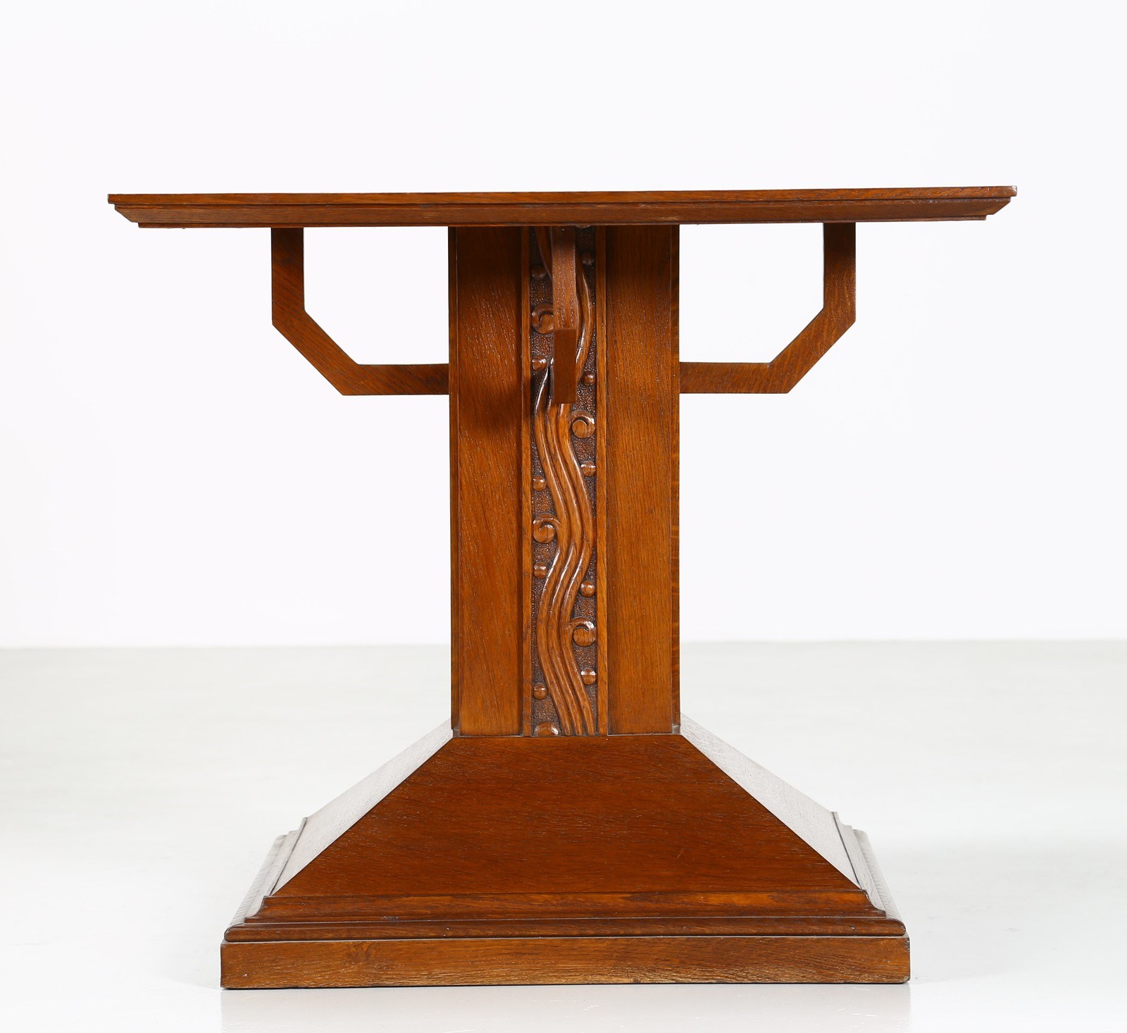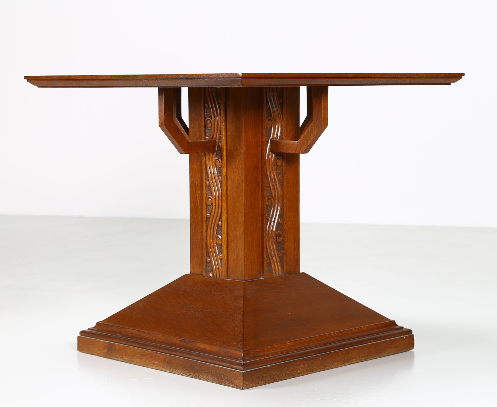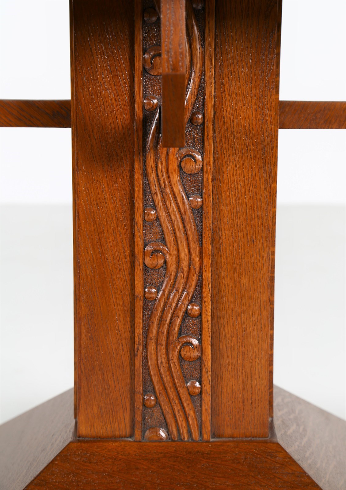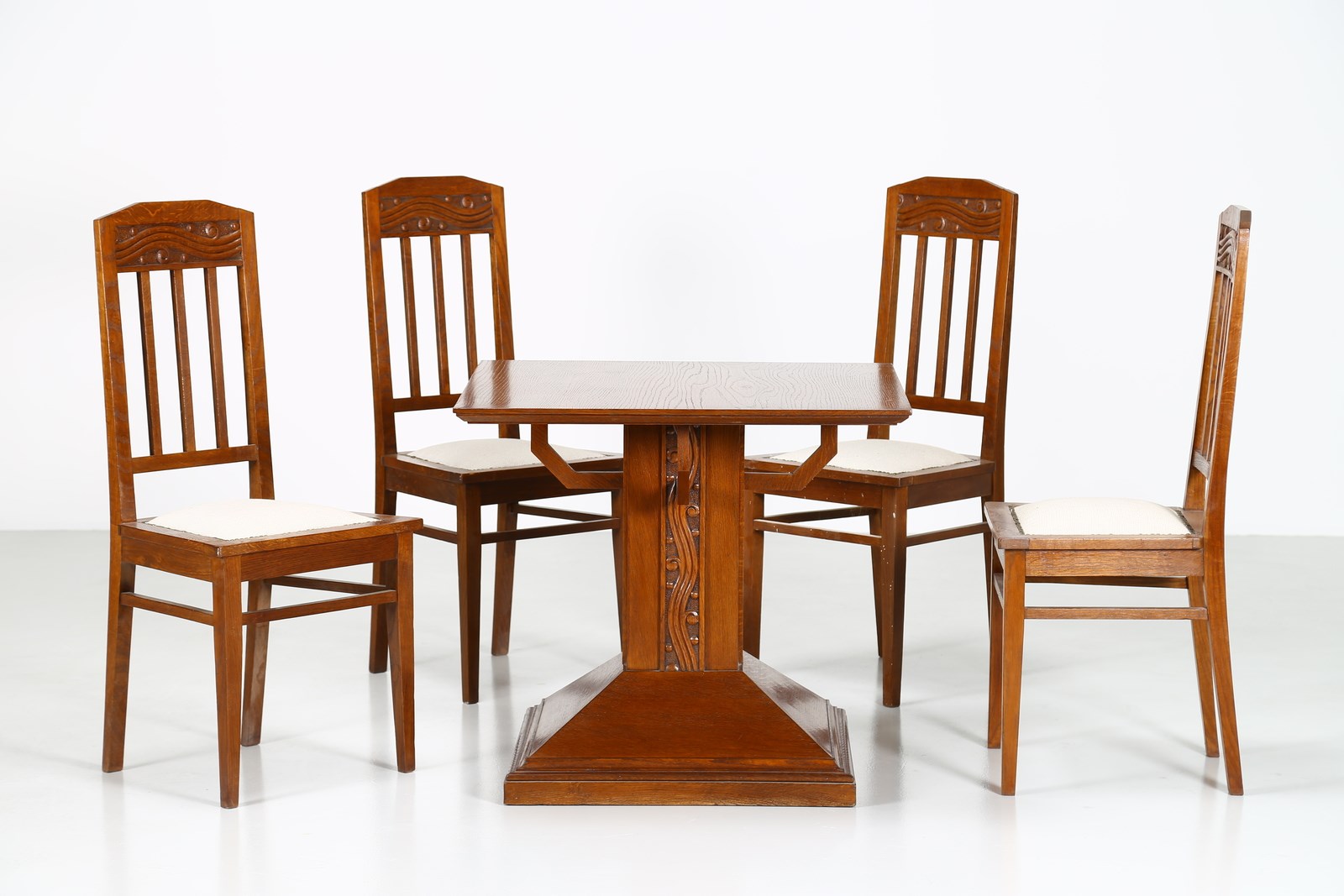 PORTALUPPI PIERO (1888 - 1967) Tavolo e quattro sedie. Legno di rovere. Cm 78,50 x 70,00 x 78,50. Tavolo in legno di rovere intagliato, sedie in legno di rovere intagliato, tessuto e dettagli in ottone. Anni 10.Misura sedie: H 103 cm x L 45,5 cm x P 40 cm , altezza seduta: 46 cmSi ringrazia la Fondazione Piero Portaluppi per la conferma verbale di attribuzione a Piero Portaluppi.