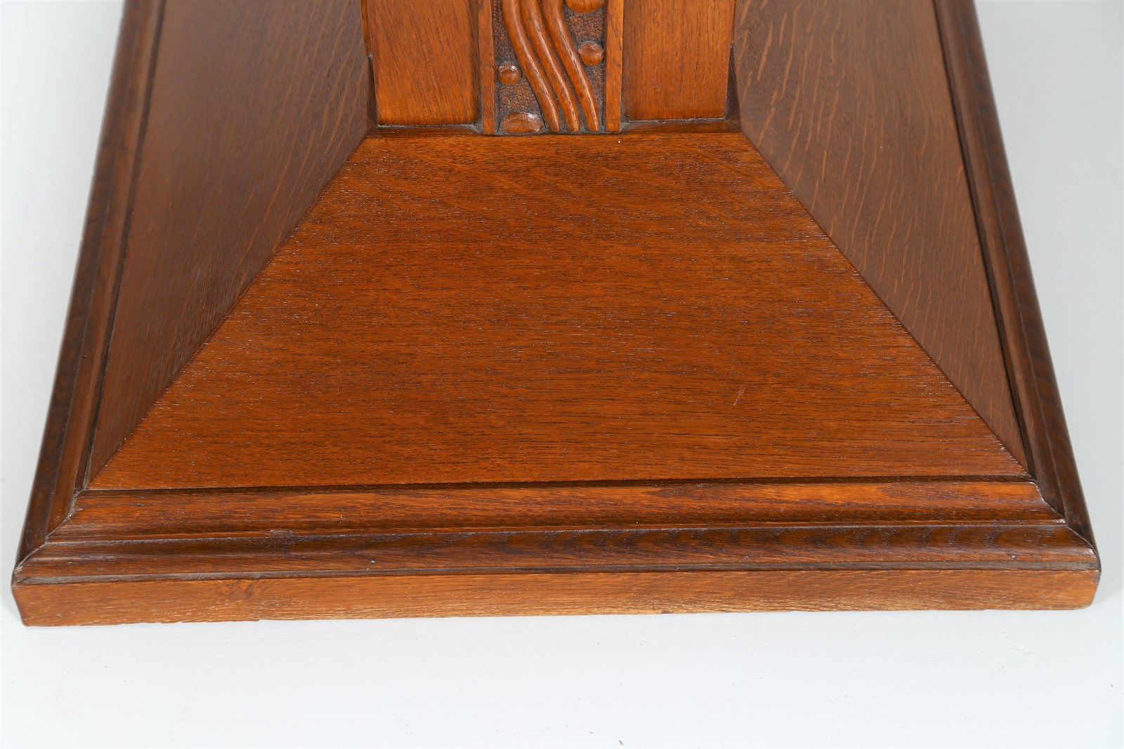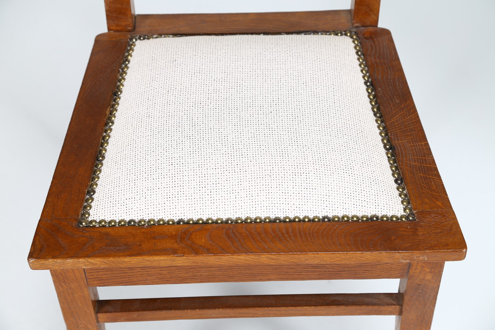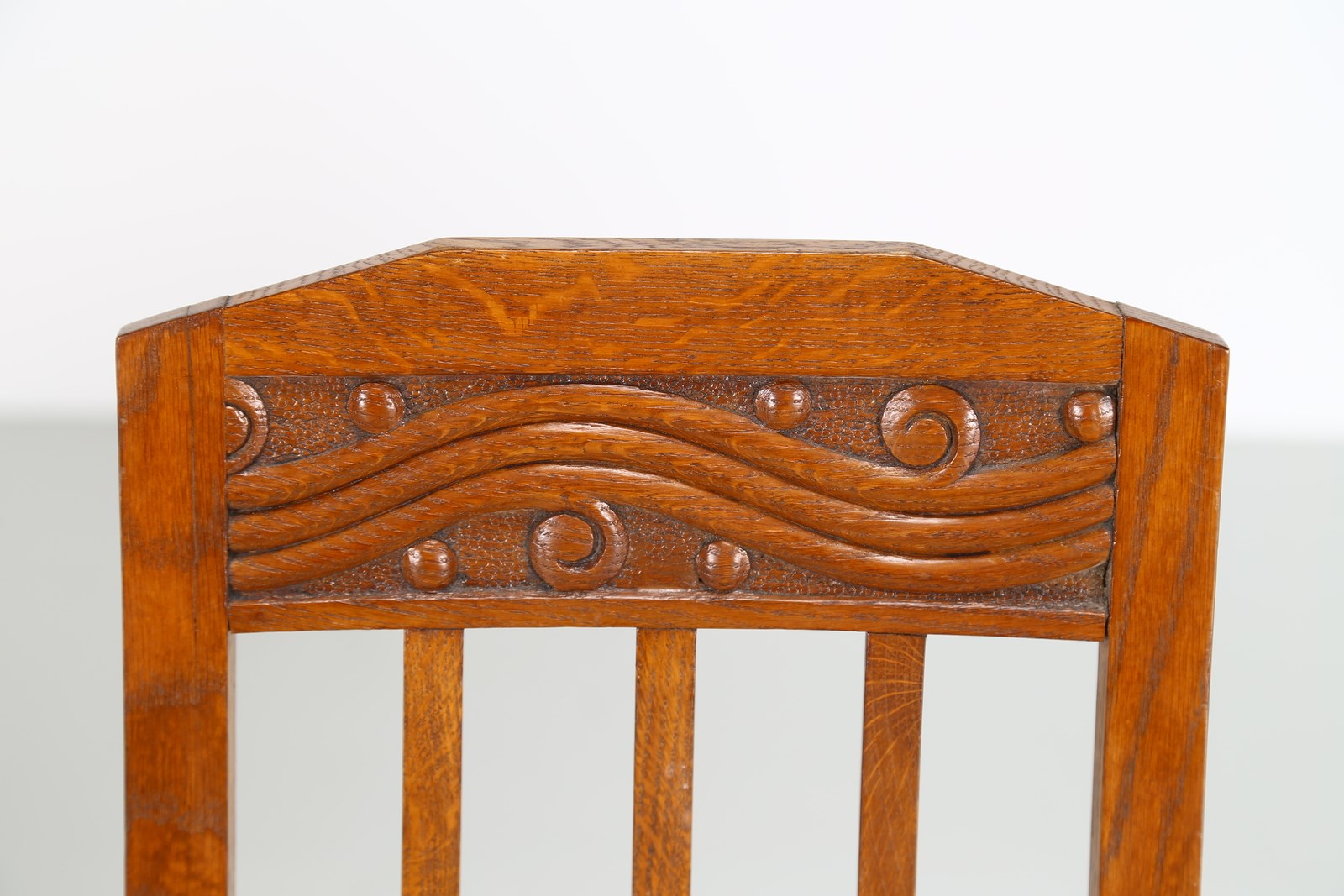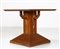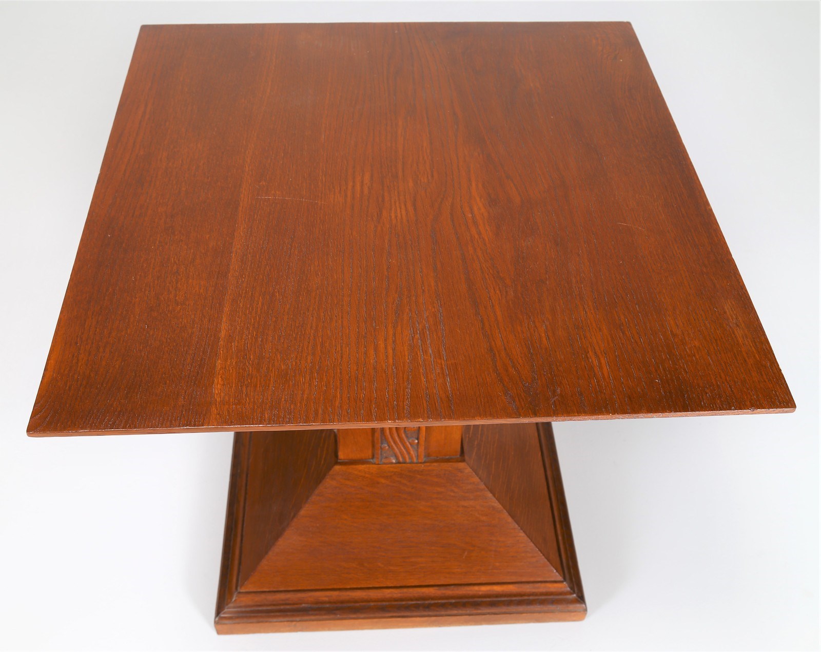 PORTALUPPI PIERO (1888 - 1967) Tavolo e quattro sedie. Legno di rovere. Cm 78,50 x 70,00 x 78,50. Tavolo in legno di rovere intagliato, sedie in legno di rovere intagliato, tessuto e dettagli in ottone. Anni 10.Misura sedie: H 103 cm x L 45,5 cm x P 40 cm , altezza seduta: 46 cmSi ringrazia la Fondazione Piero Portaluppi per la conferma verbale di attribuzione a Piero Portaluppi.
