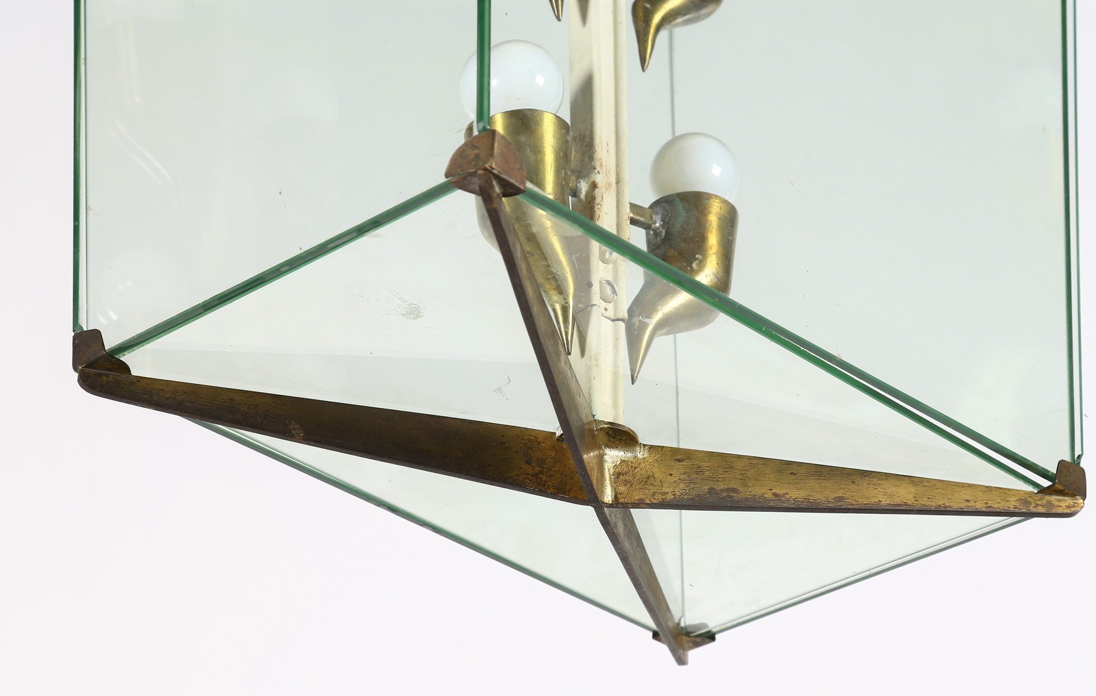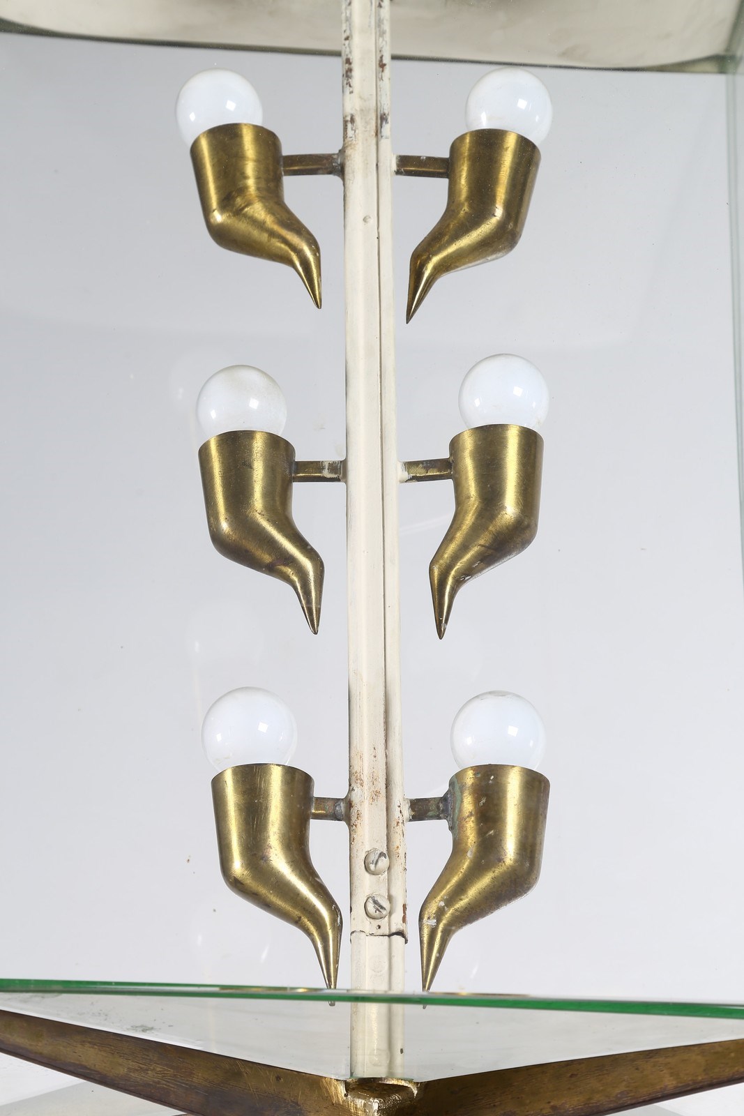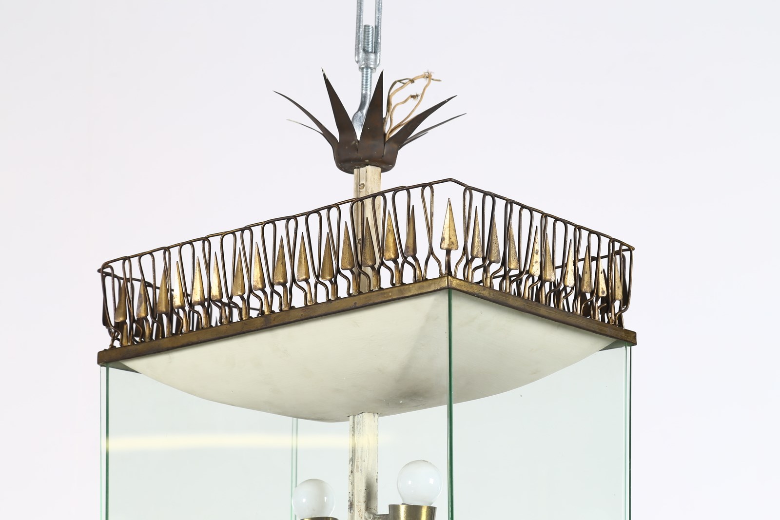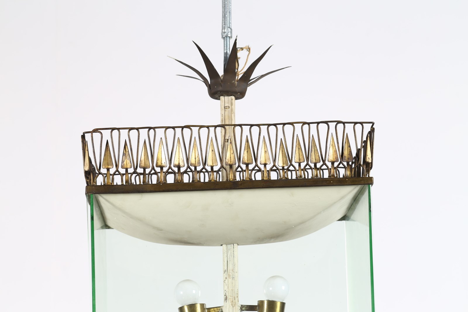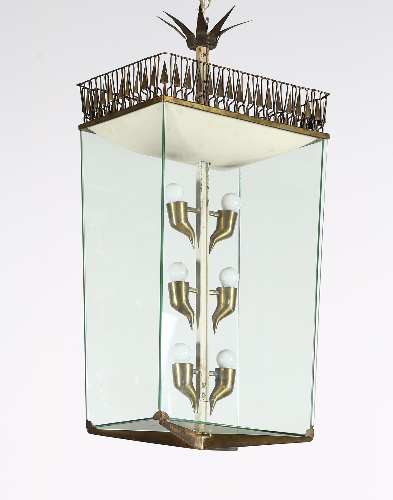 CHIESA PIETRO (1892 - 1948) Lampadario. Metallo laccato, ottone, vetro. Cm 47,50 x 92,00 x 32,00. Lampadario in metallo laccato e dorato con profili in ottone, lamine in vetro. Anni 40.