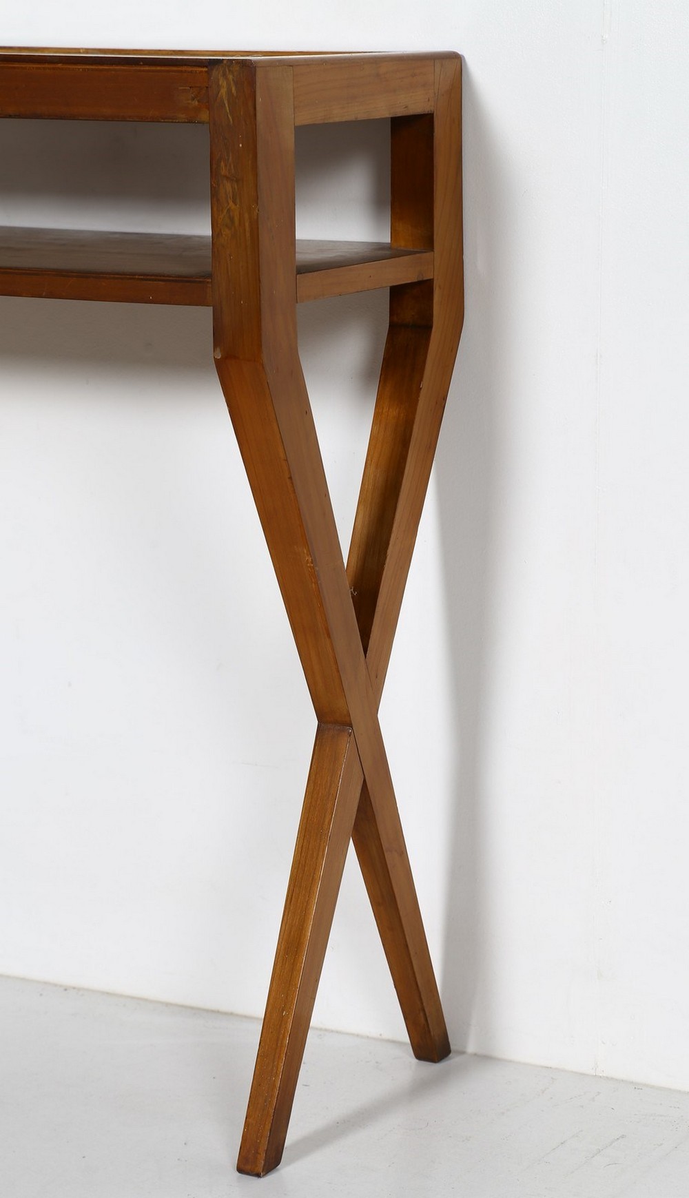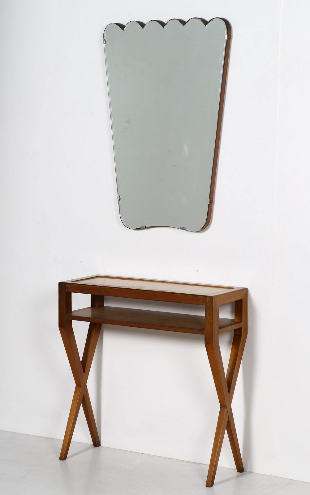 PONTI GIO (1891 - 1979) Consolle e specchio. Legno e specchio. Cm 78,50 x 80,00 x 30,00. Consolle in legno con specchio, anni 50. Misura specchio: 91 cm x 63 cm x 3,5 cm