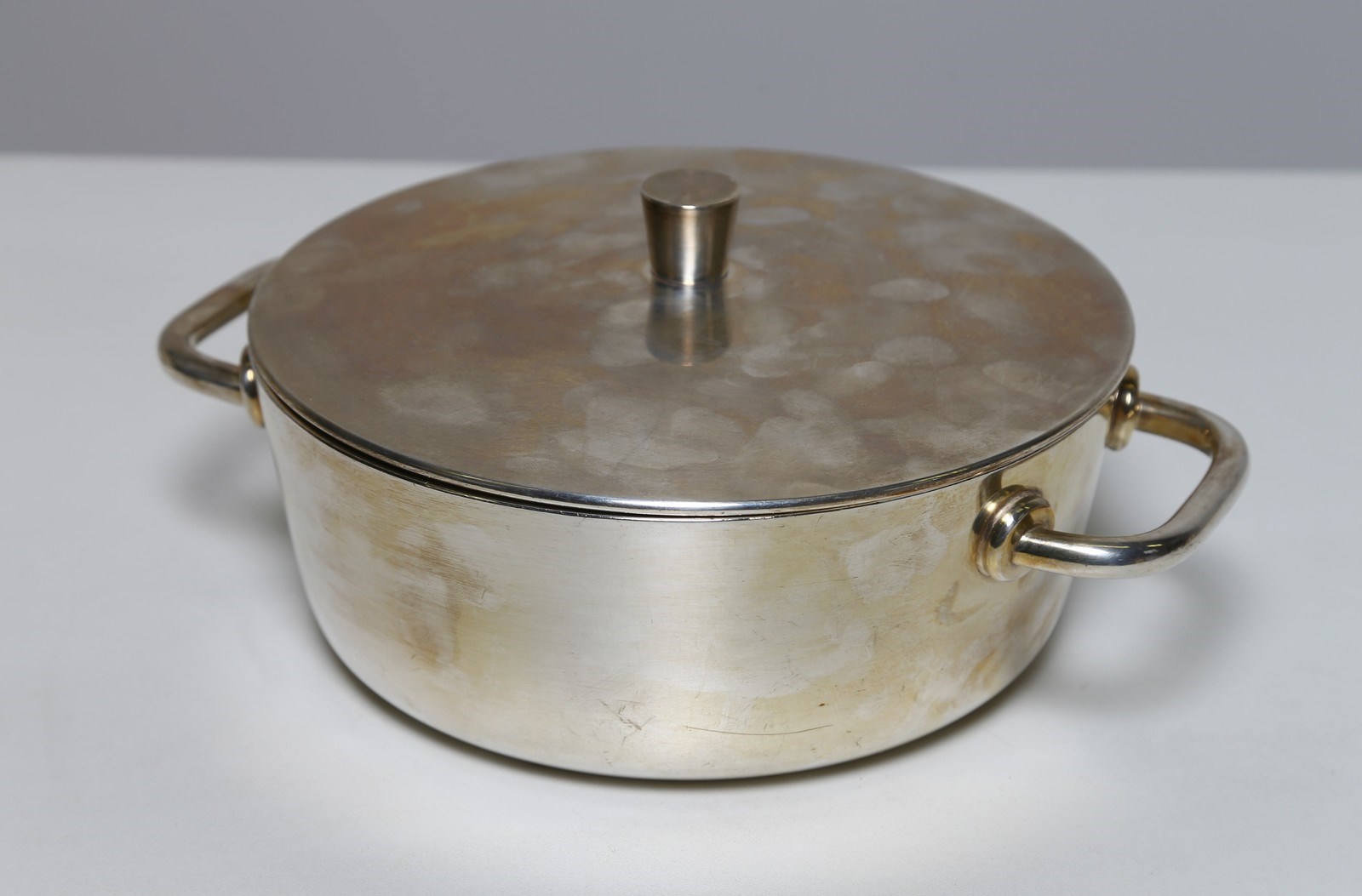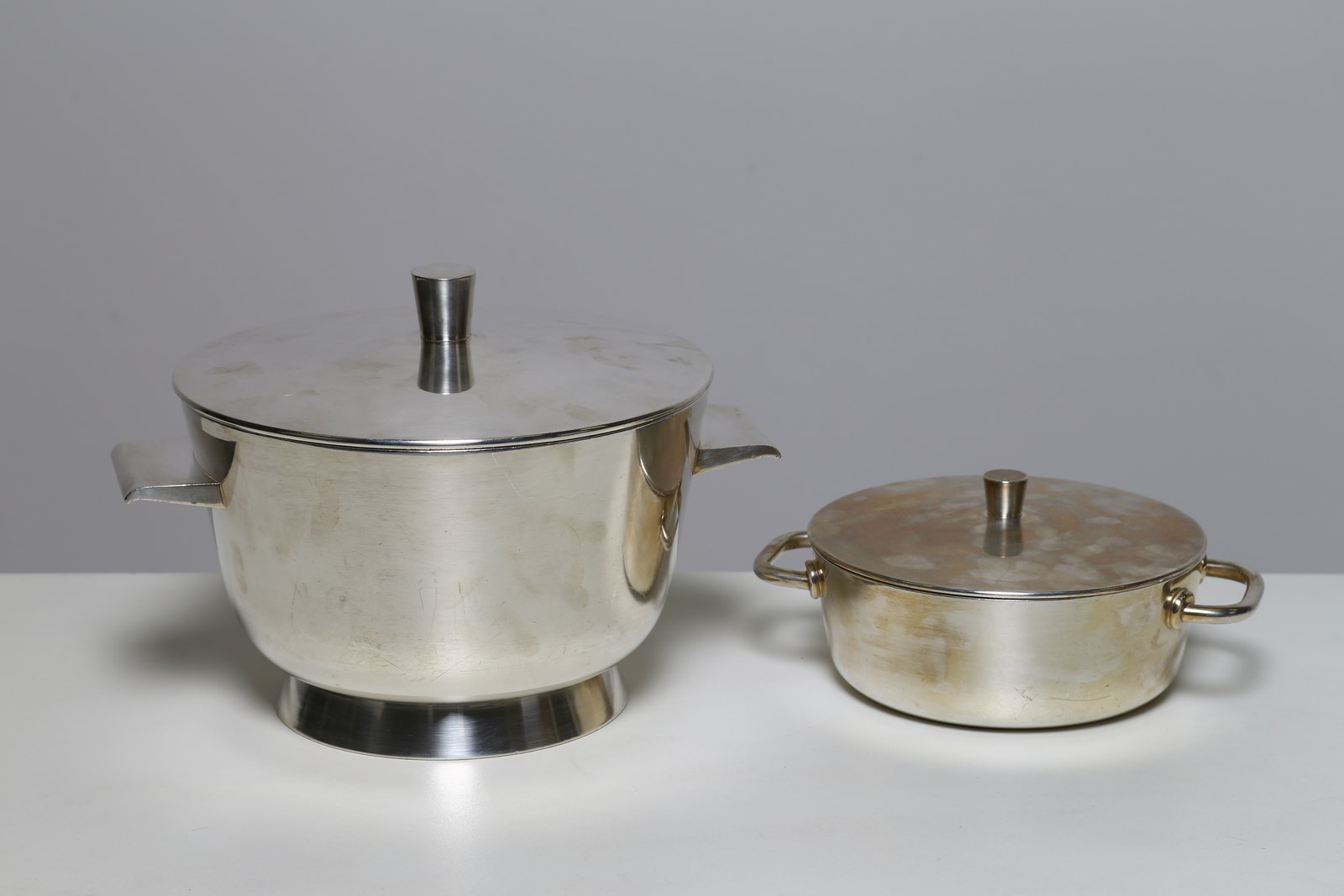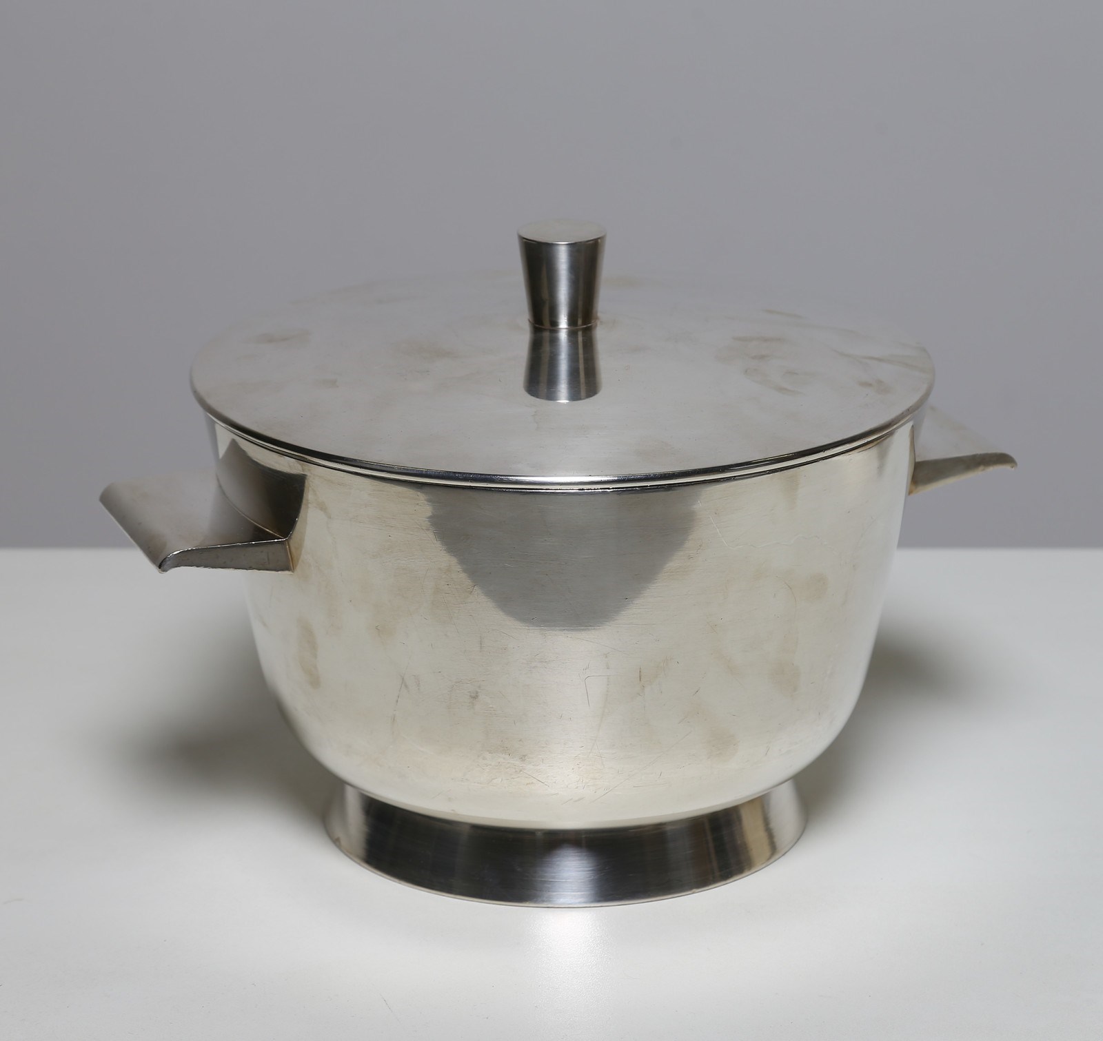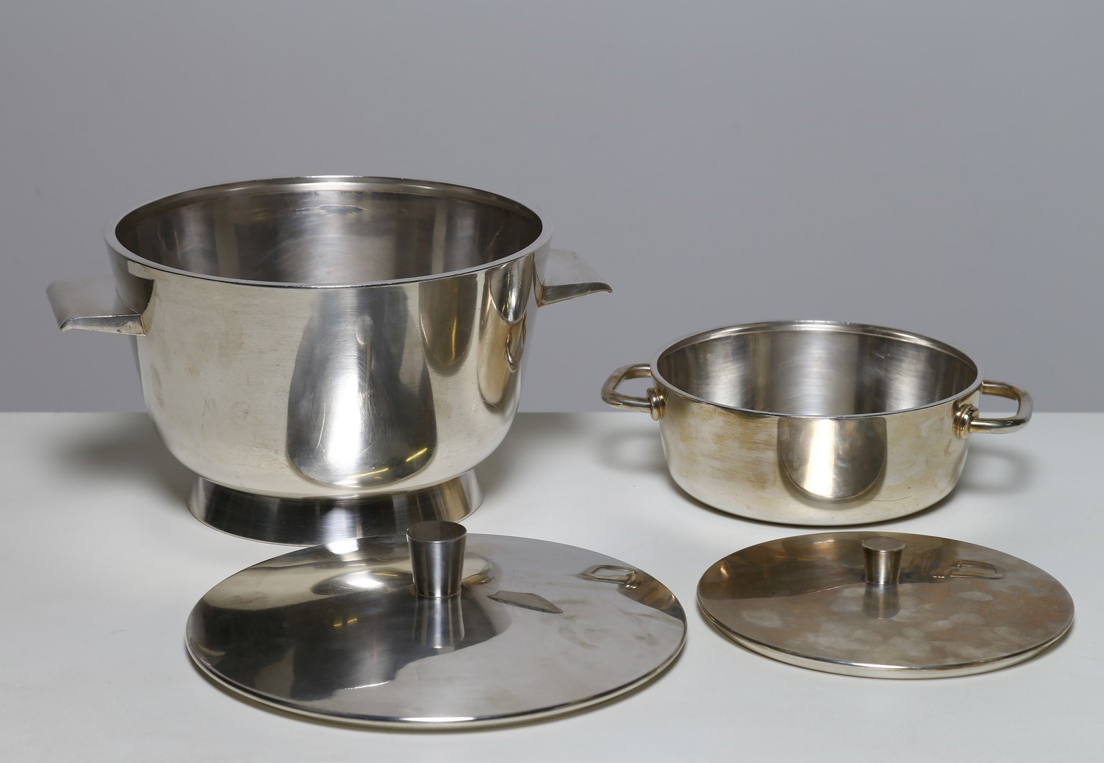 PONTI GIO (1891 - 1979) Coppia di zuppiere. Lega metallica. Cm 35,00 x 24,00 x 29,00. Coppia di zuppiere in lega metallica, per Krupp, anni 40/50. Presente il marchio Krupp Milano alla base. Provenienza zuppiera grande: Grande Albergo Imperatore Traiano, Roma Misure zuppiera piccola: H 12 cm L 27 cm P 22 cm
