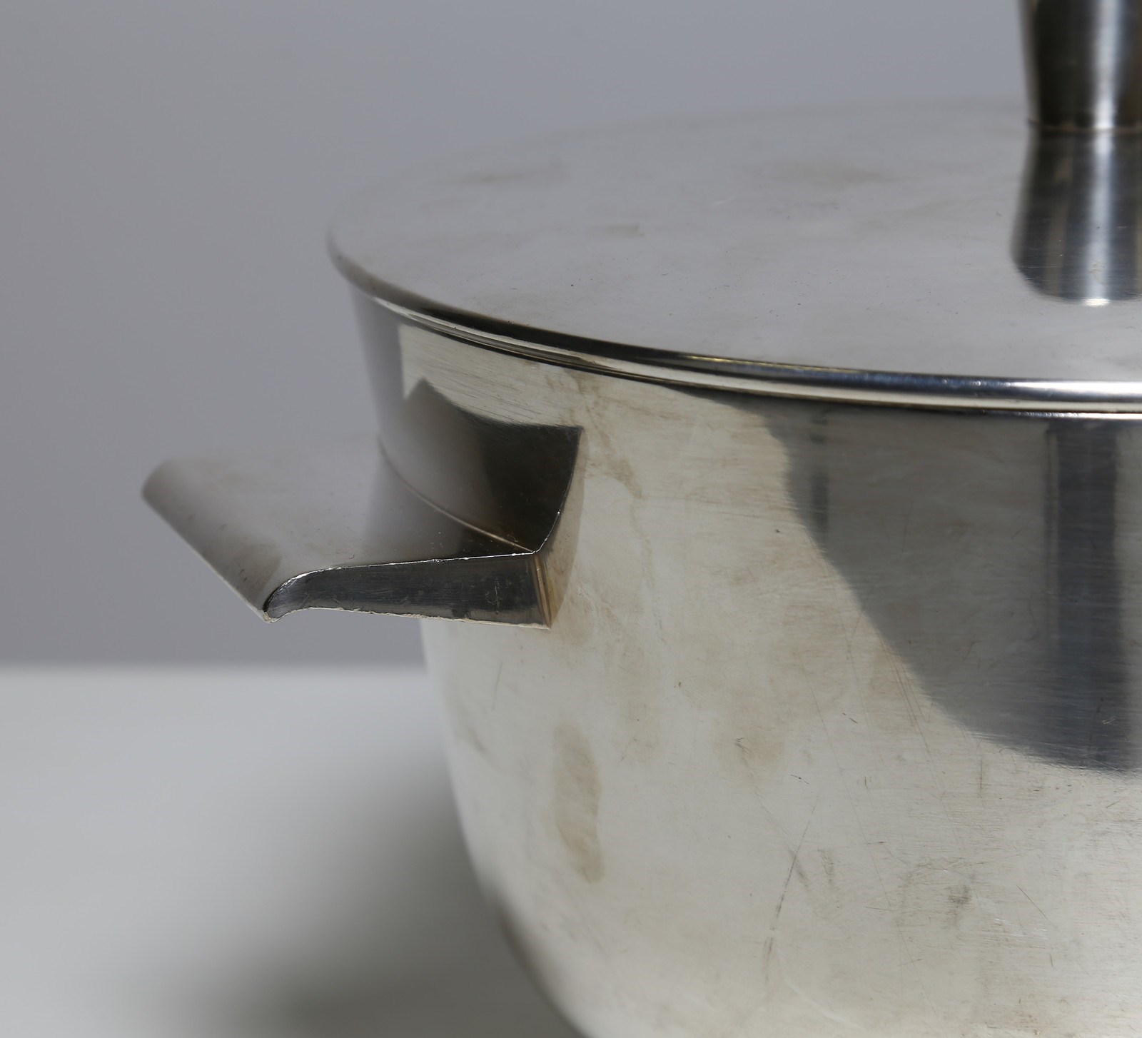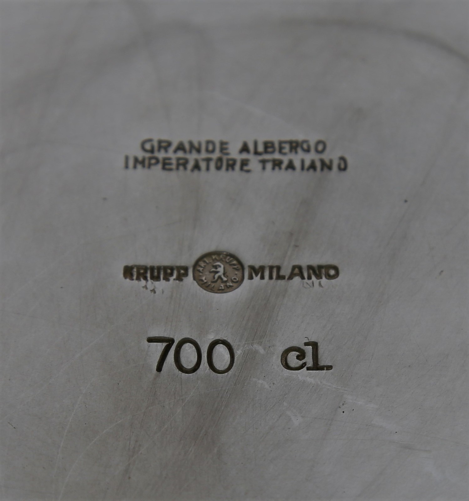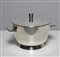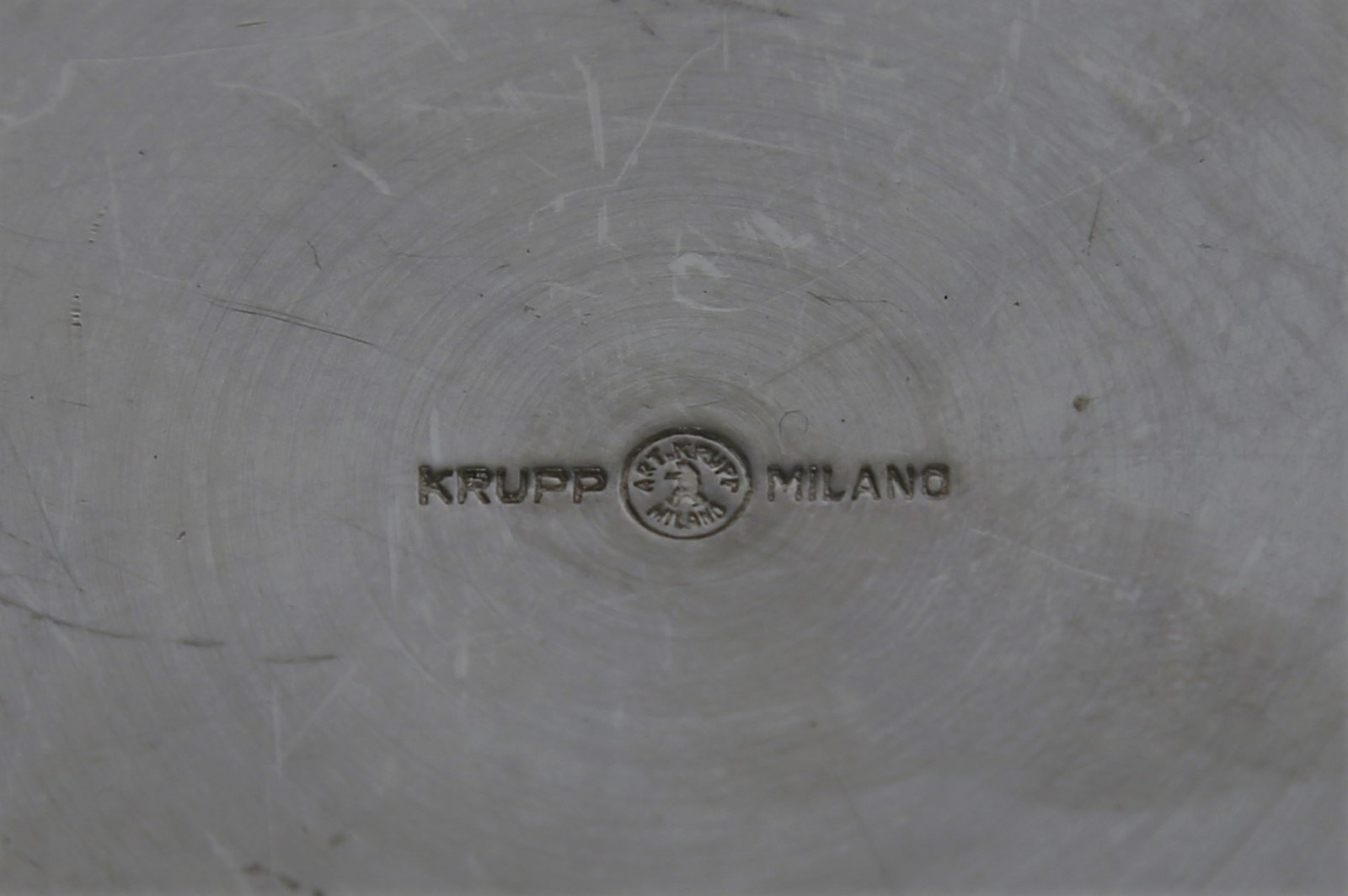 PONTI GIO (1891 - 1979) Coppia di zuppiere. Lega metallica. Cm 35,00 x 24,00 x 29,00. Coppia di zuppiere in lega metallica, per Krupp, anni 40/50. Presente il marchio Krupp Milano alla base. Provenienza zuppiera grande: Grande Albergo Imperatore Traiano, Roma Misure zuppiera piccola: H 12 cm L 27 cm P 22 cm