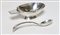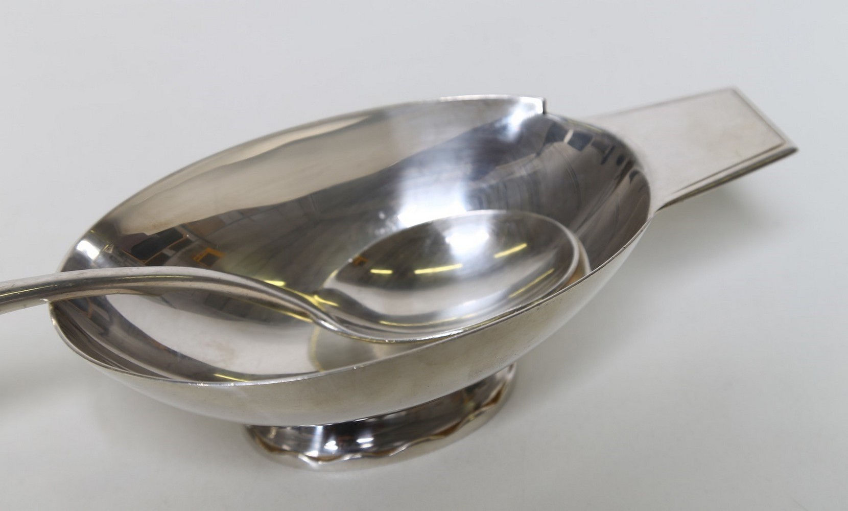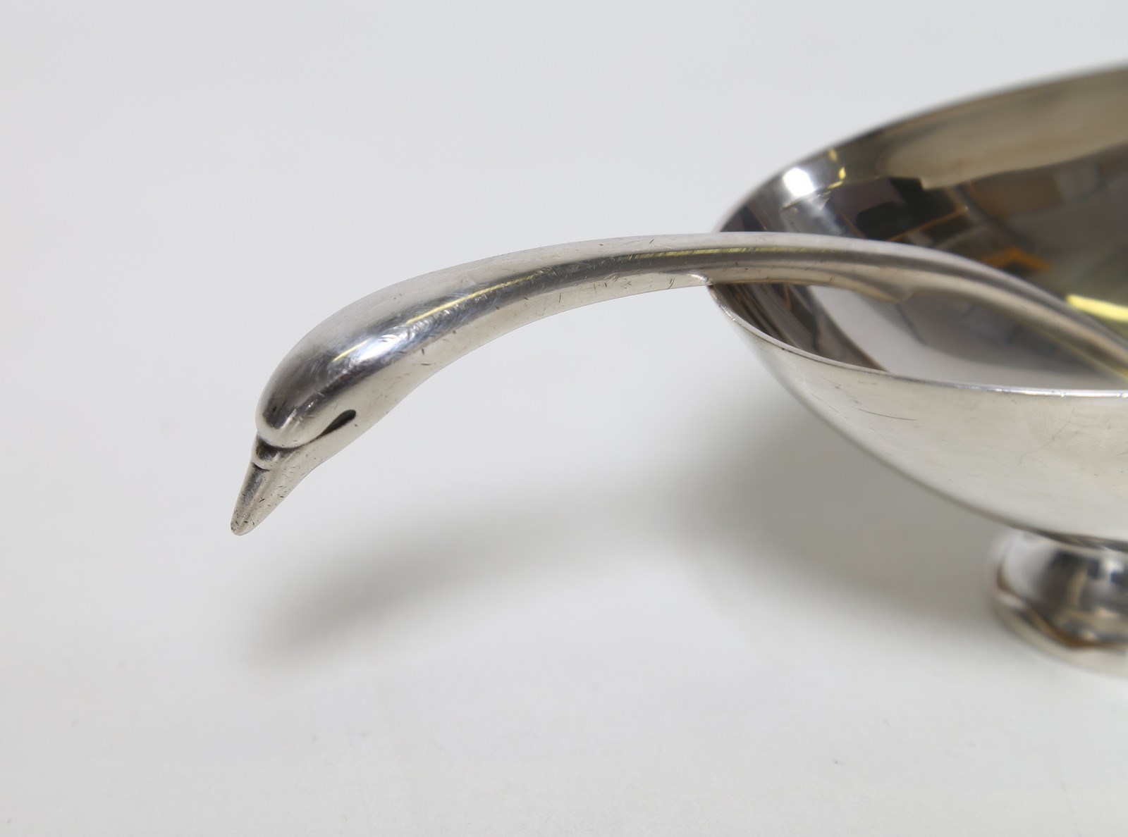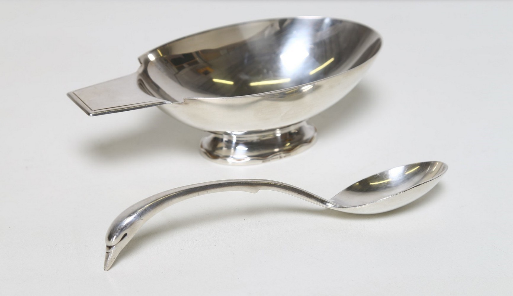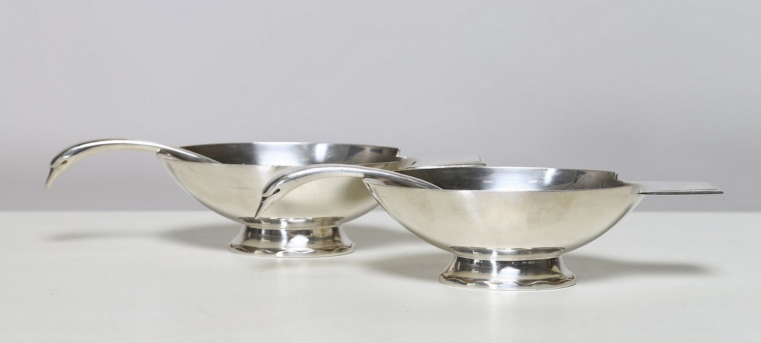 PONTI GIO (1891 - 1979) Coppia di salsiere. Lega metallica. Cm 27,00 x 7,00 x 10,00. Coppia di salsiere per Christofle Gallià, anni 50. Lega metallica con cucchiai che formano la figura di due cigni. Presente marchio alla base.