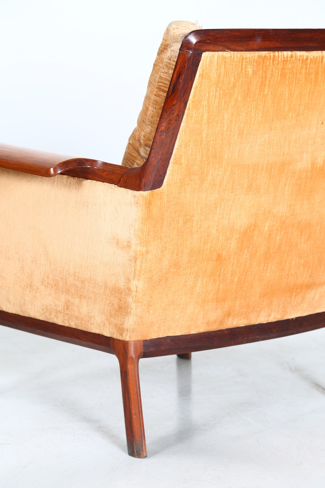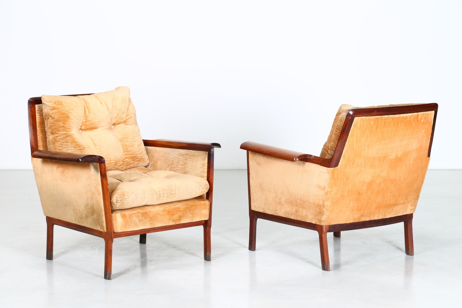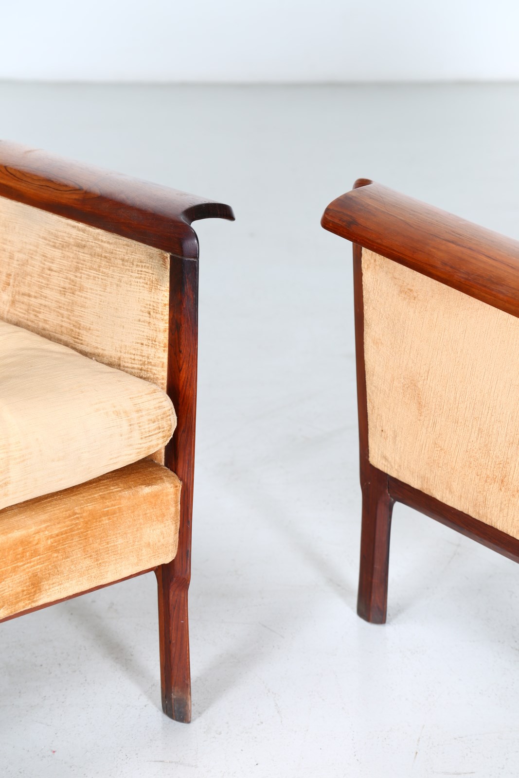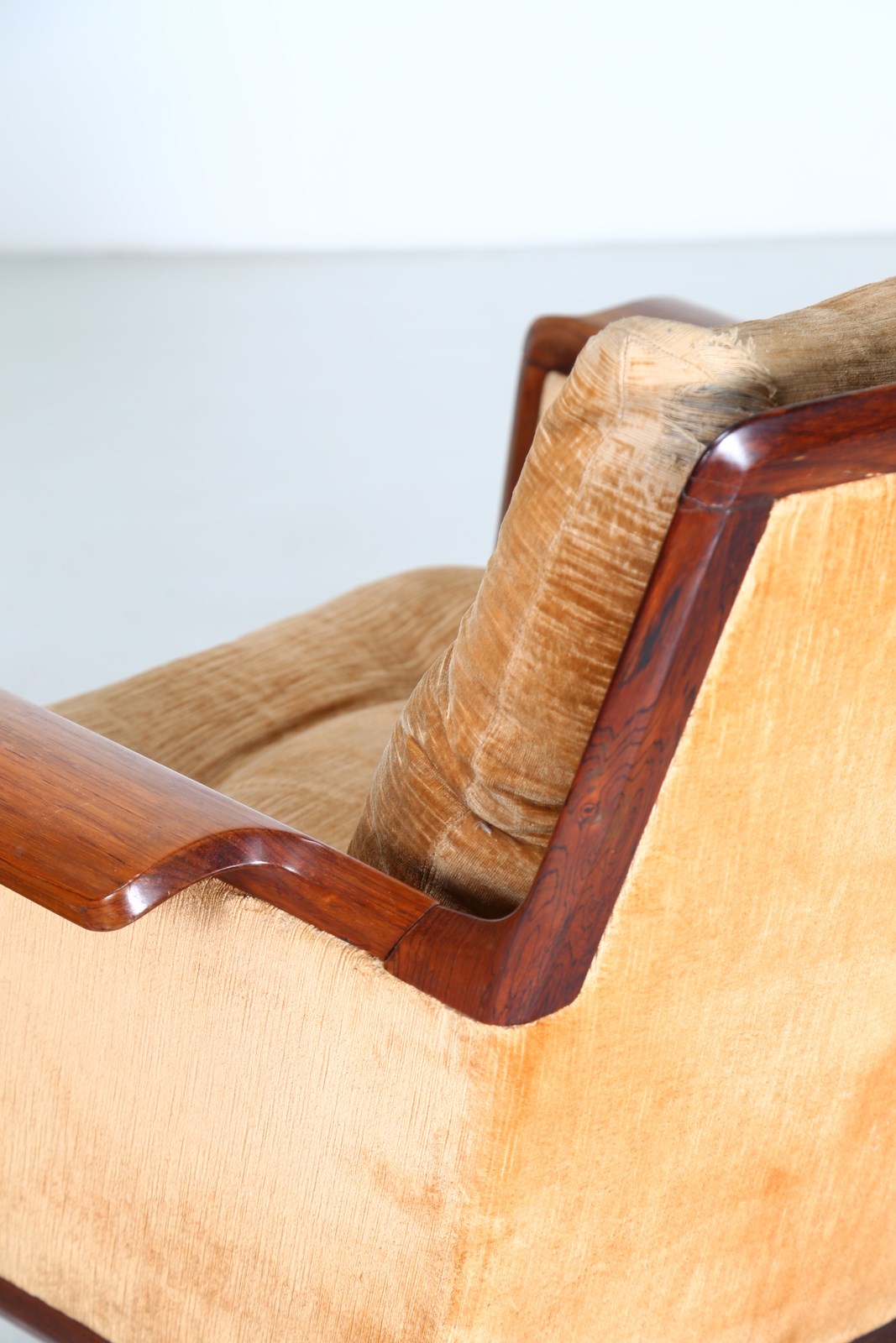 SCREMIN LUIGI (1896 - 1983) Attrib. Coppia di poltrone. Legno di palissandro e tessuto. Cm 85,00 x 80,50 x 78,00. Coppia di poltrone con intelaiatura in legno di palissandro, imbottitura e rivestimento in tessuto; anni 40.