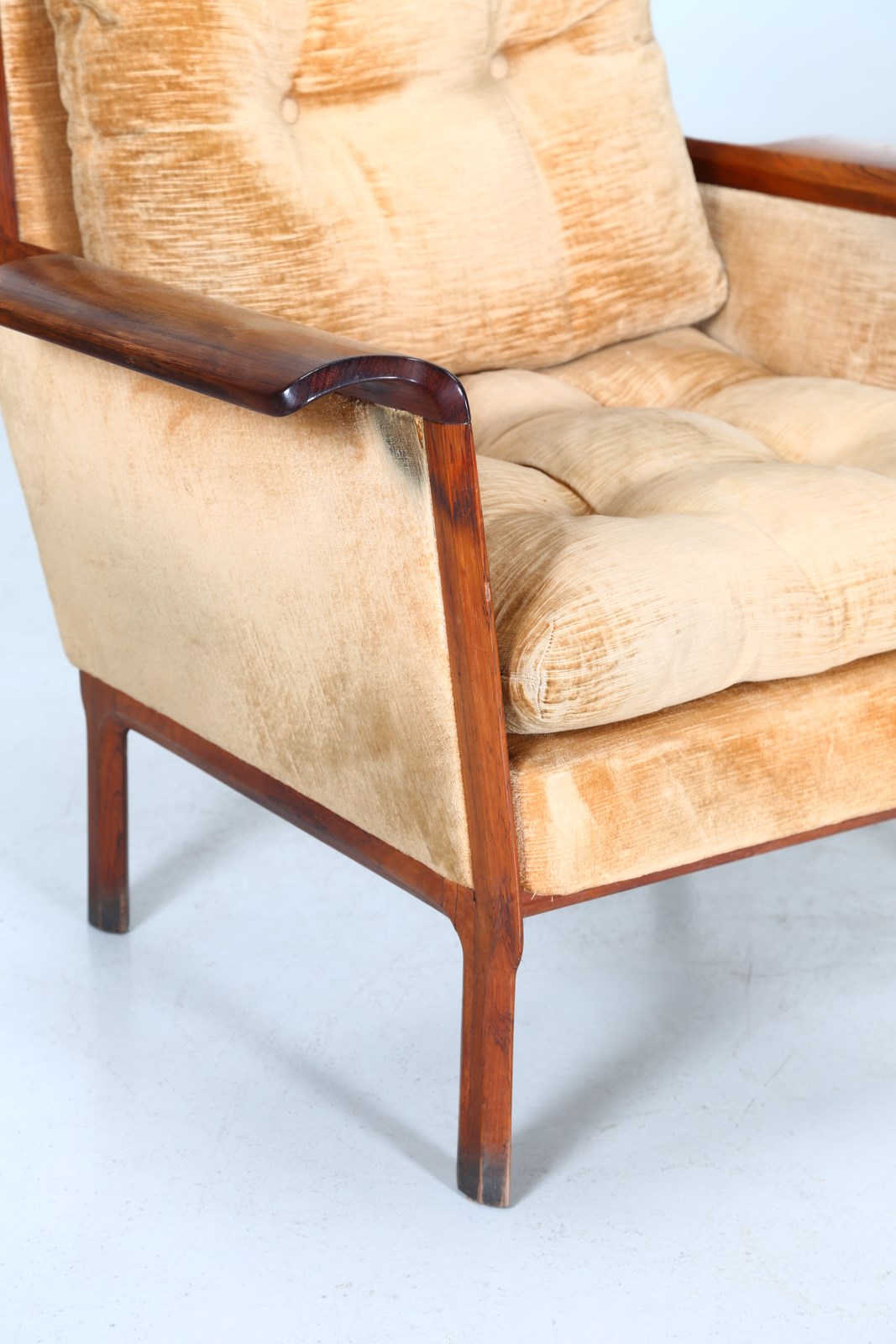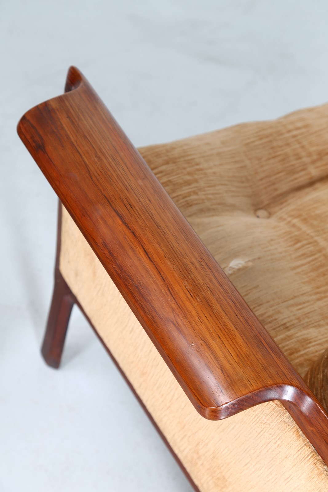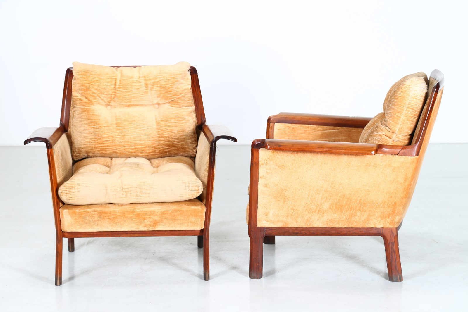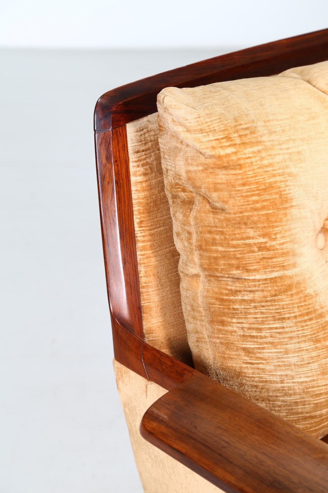 SCREMIN LUIGI (1896 - 1983) Attrib. Coppia di poltrone. Legno di palissandro e tessuto. Cm 85,00 x 80,50 x 78,00. Coppia di poltrone con intelaiatura in legno di palissandro, imbottitura e rivestimento in tessuto; anni 40.