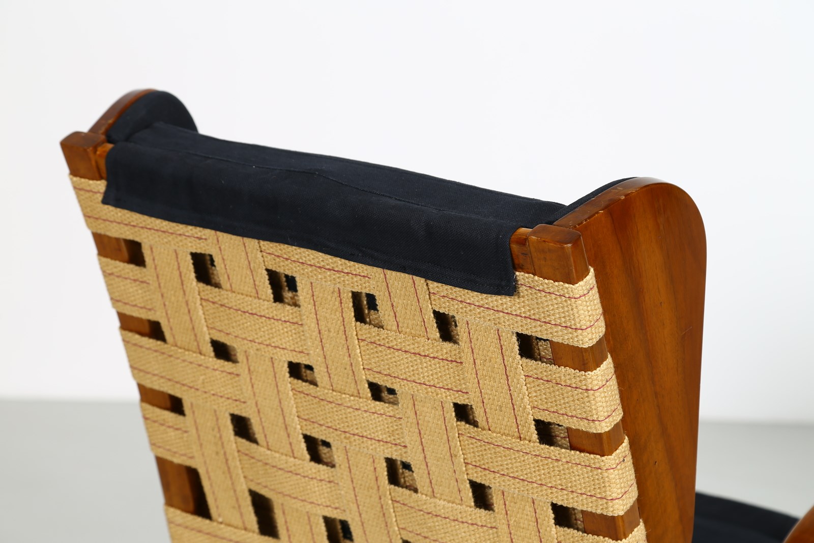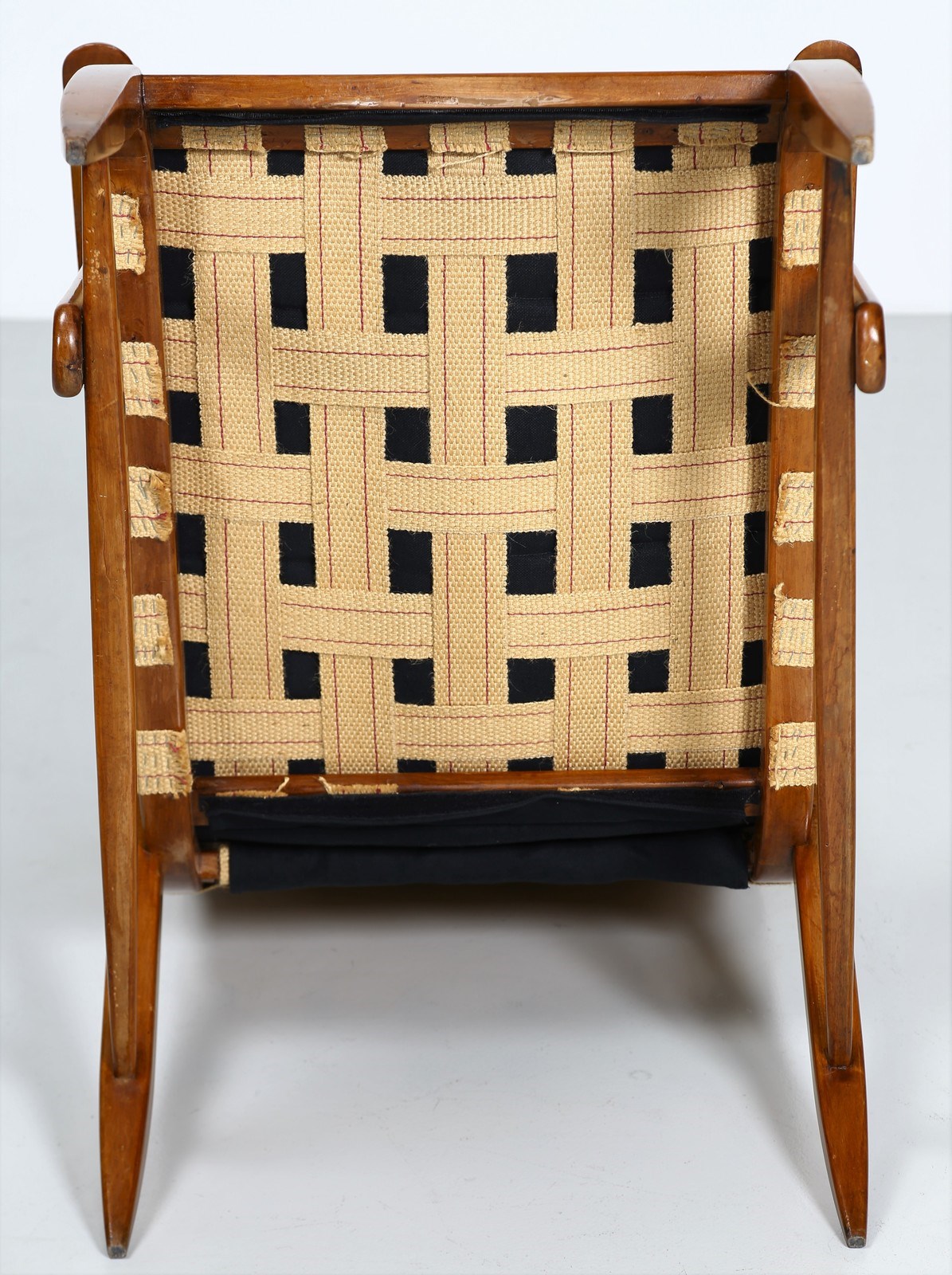 BEGA MELCHIORRE (1898 - 1976) Coppia di poltrone. Legno e tessuto. Cm 62,00 x 99,00 x 104,00. Coppia di poltrone in legno di noce, rafia intrecciata e tessuto imbottito, anni 30. Pubblicazioni: Domus, n. 164, agosto 1941, copertina - Domus, n. 165, settembre 1941, servizio su Casa Bega, p. 16-17-18-19 - Stile, Garzanti Editore, n. 23, novembre 1942, p. 17