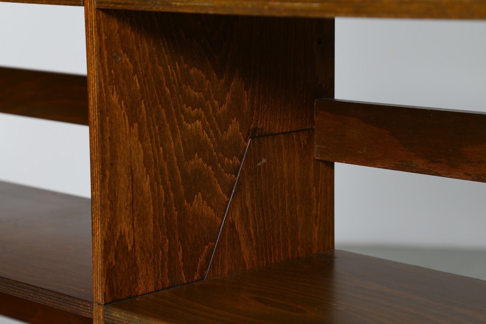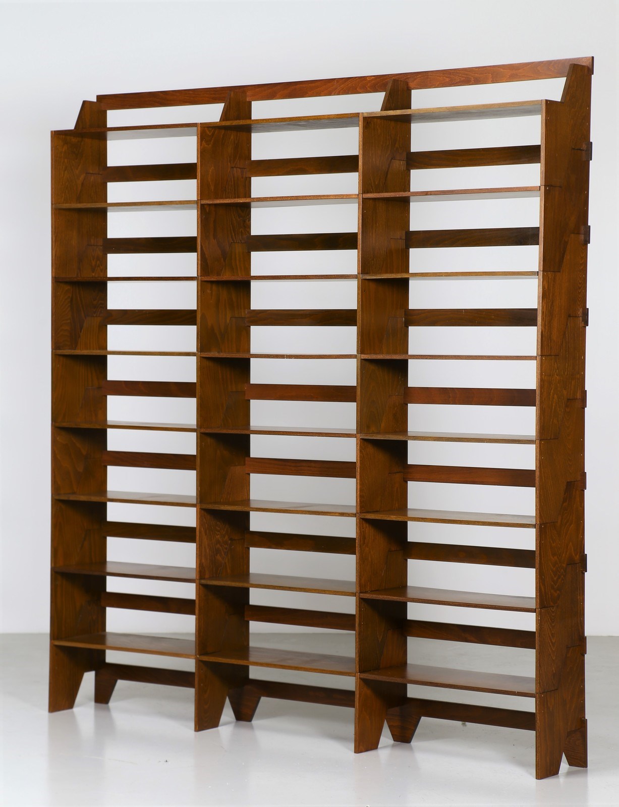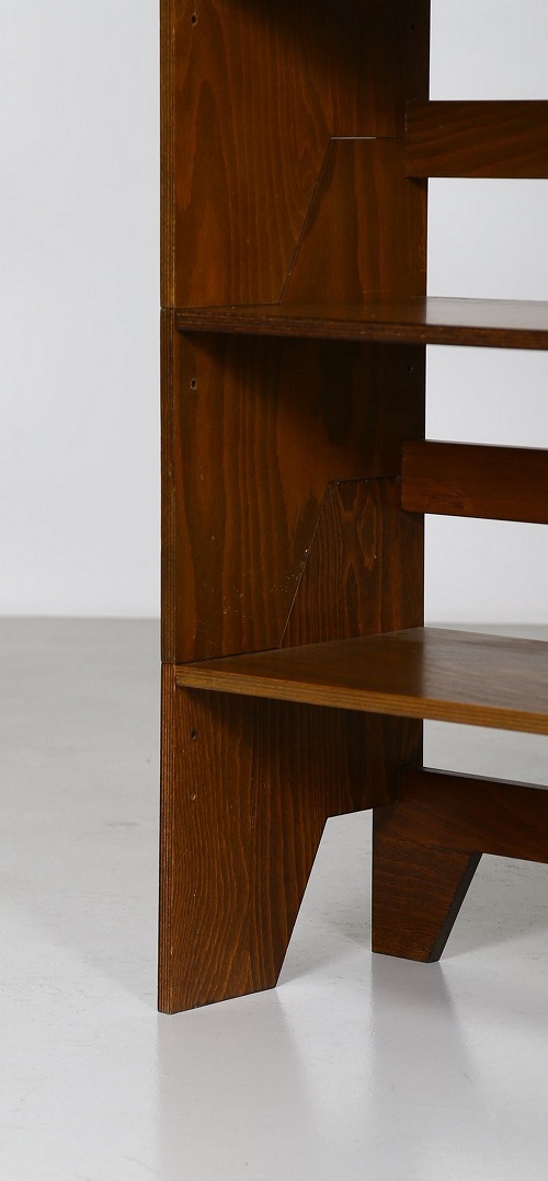 FORTI RENATO (n. 1923) Libreria. Legno. . Libreria in legno di faggio, modello F54, per MC Selvini, data del disegno 1954.La F54 progettata da Renato Forti nel 1954, nasce dall’idea che la libreria debba essere un mobile “al servizio” di un lettore accanito e quindi in grado di crescere sia in altezza che in larghezza (anche un piano alla volta) per accogliere nuovi libri. La libreria è stata quindi disegnata come uno scaffale a elementi: fianco piano e traversa, da assemblare a incastro senza né viti né colla.