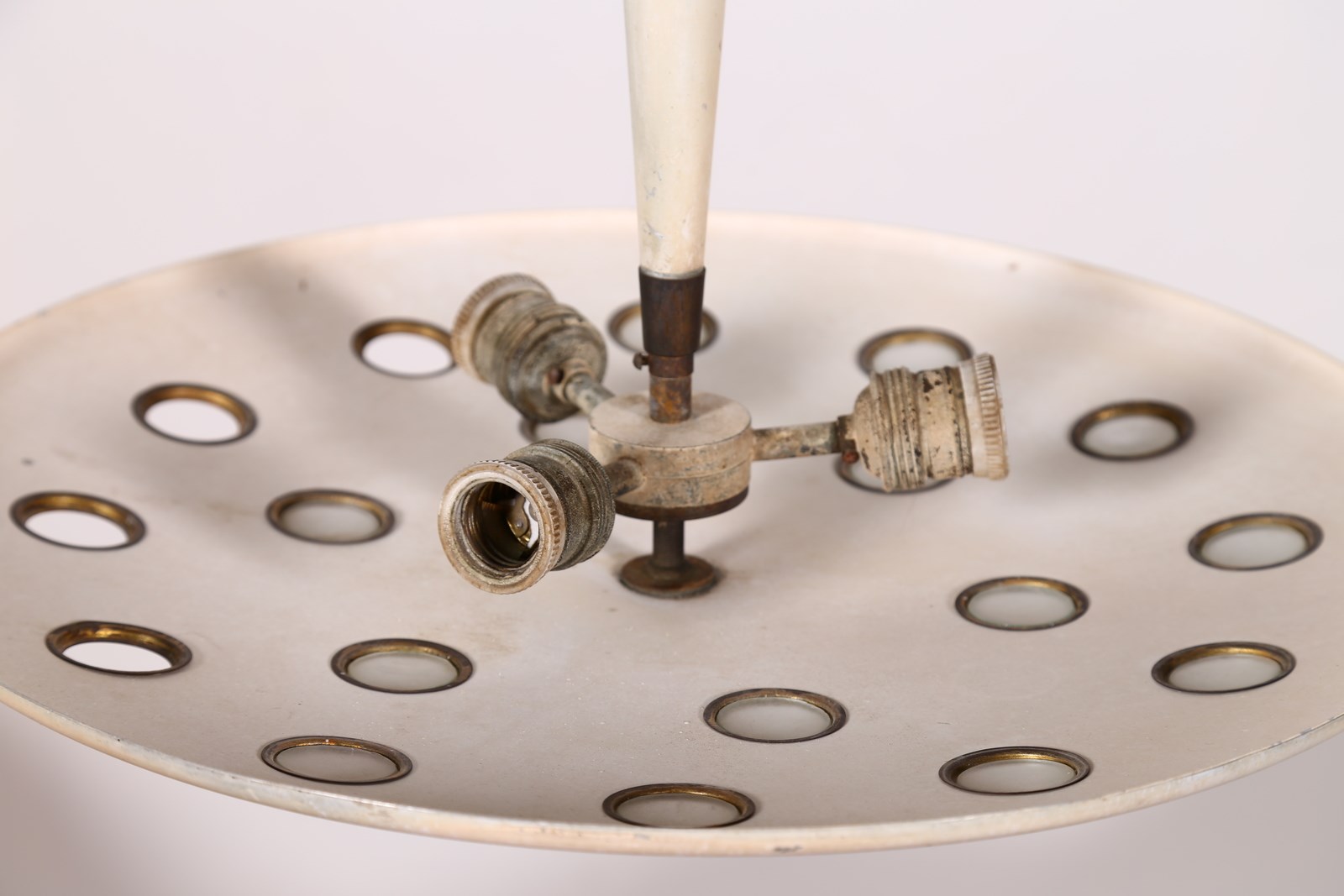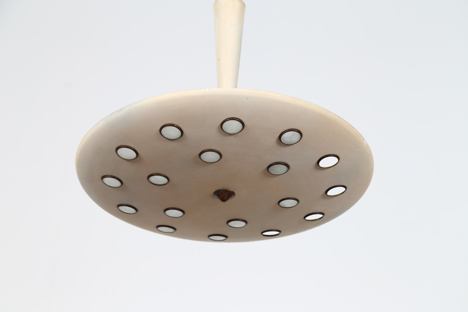 LUMEN MILANO Lampada da soffitto. Metallo laccato, ottone, vetro. Cm 49,00 x 62,00 x 49,00. Metallo laccato, ottone e vetri satinati, anni 50.