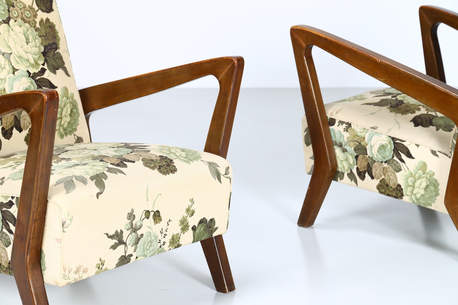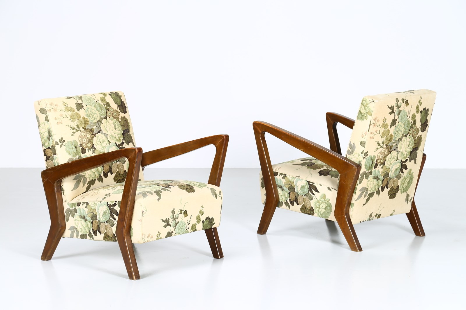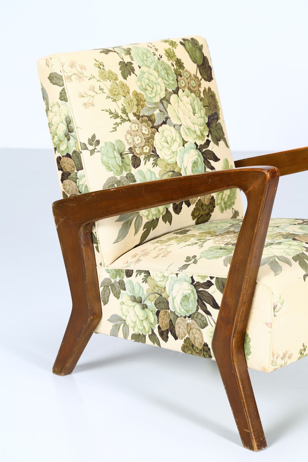 PONTI GIO (1891 - 1979) Coppia di poltrone. Tessuto e legno. Cm 68,00 x 81,50 x 72,00. Coppia di poltrone con intelaiatura in legno, imbottitura e rivestimento in tessuto originale, anni 50.