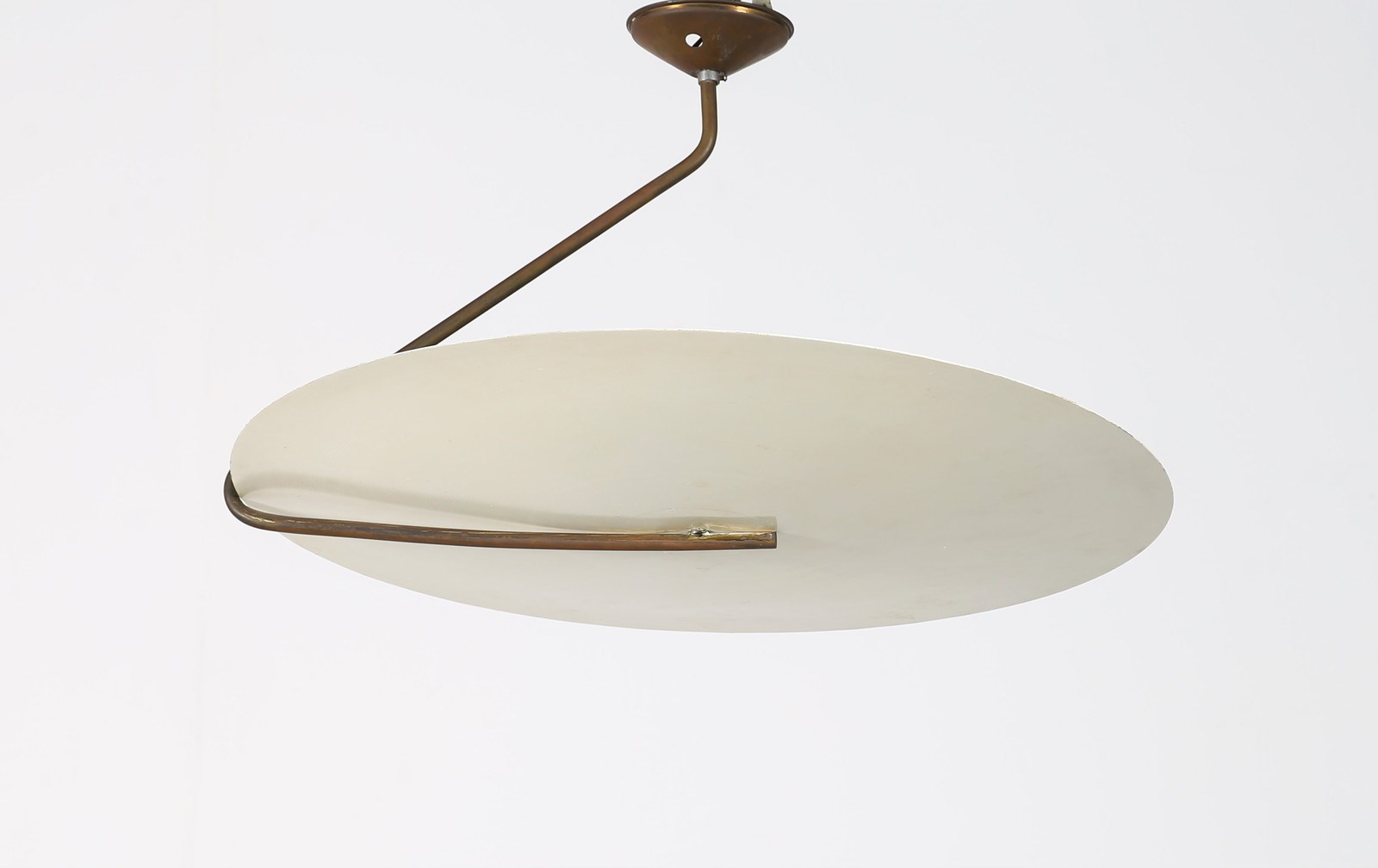 GATTA BRUNO Attrib. Lampada a soffitto. Ottone e alluminio. Cm 54,00 x 34,00 x 54,00. Rara lampada a soffitto con diffusore in ferro laccato bianco a tre luci, stelo in ottone e alluminio, per Stilnovo anni 50.