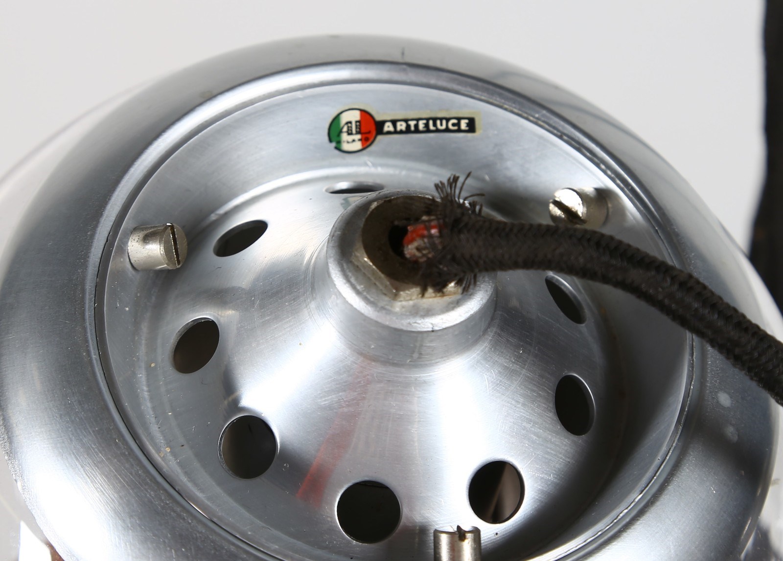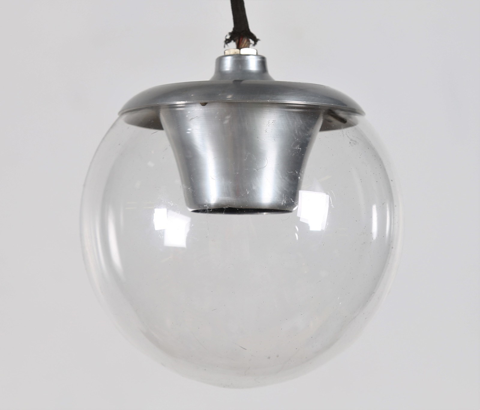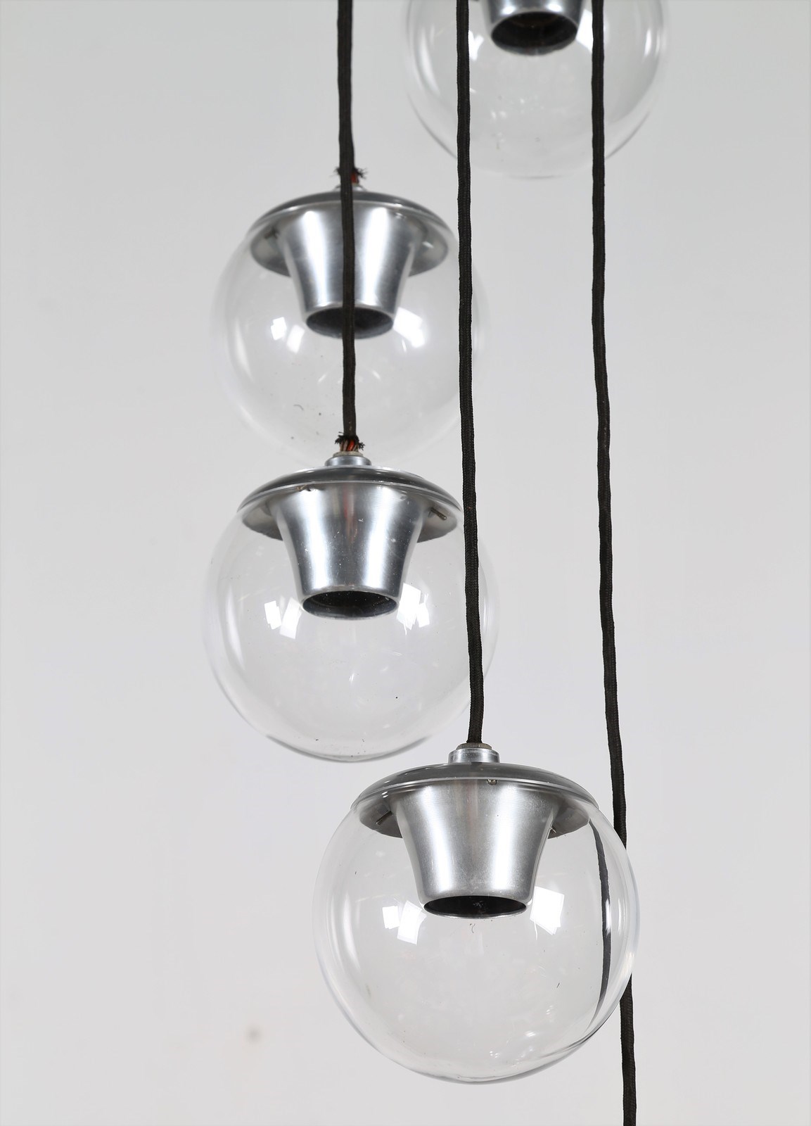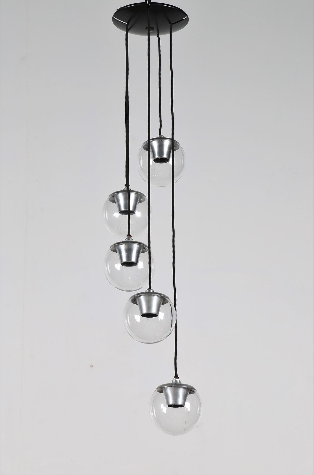 SARFATTI GINO (1912 - 1985) Lampadario. Alluminio e vetro. Cm 28,00 x 118,00 x 28,00. Lampadario a cinque sfere modello 2095/5 , per Arteluce, 1958. Diffusori a sfera in vetro trasparente con piattelli reggivetro in alluminio laccato nero. Pubblicazioni: Romanelli M., Severi S., Gino Sarfatti opere scelte 1938-1973, Silvana Editoriale, Cinisello Balsamo, 2012, p. 473