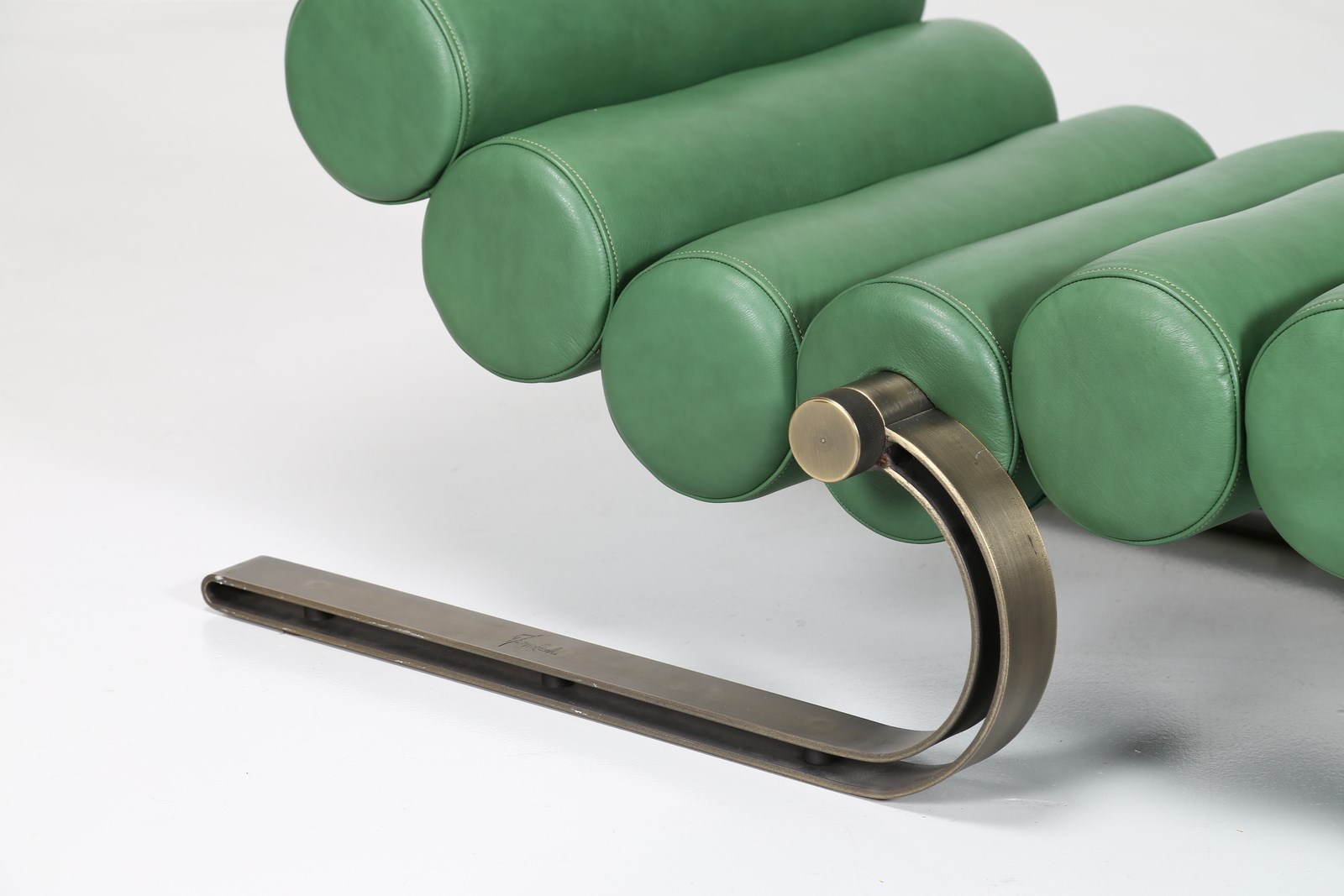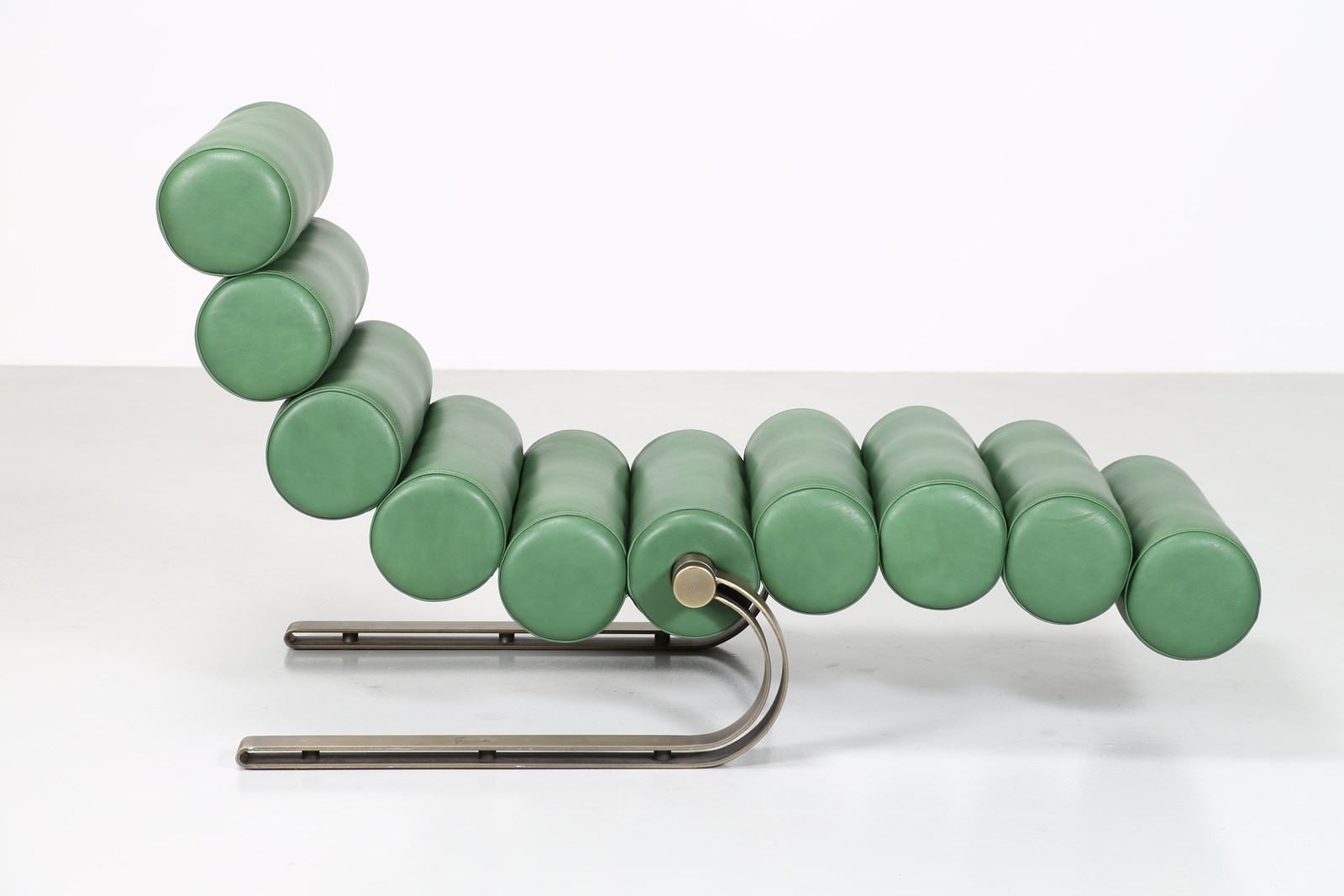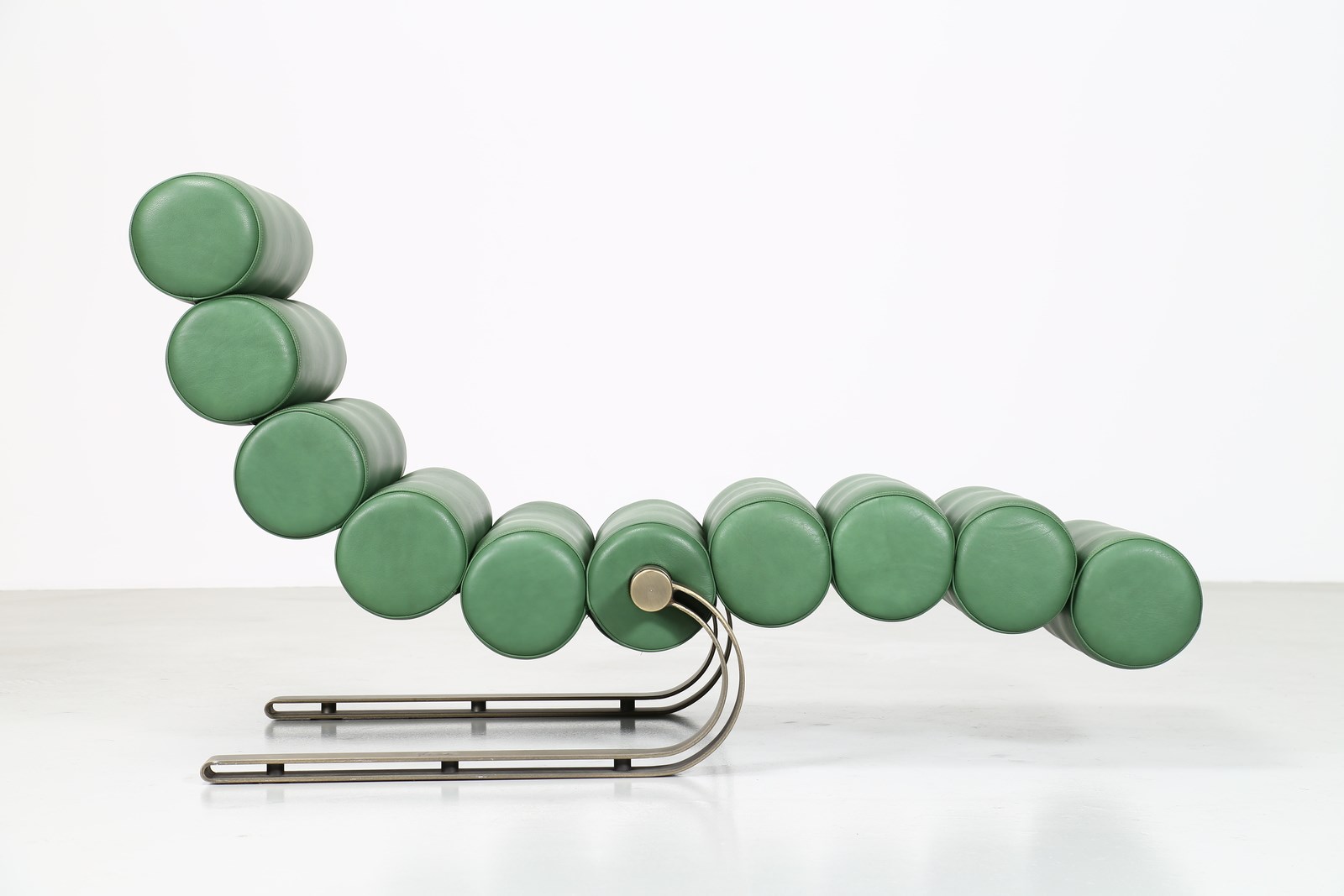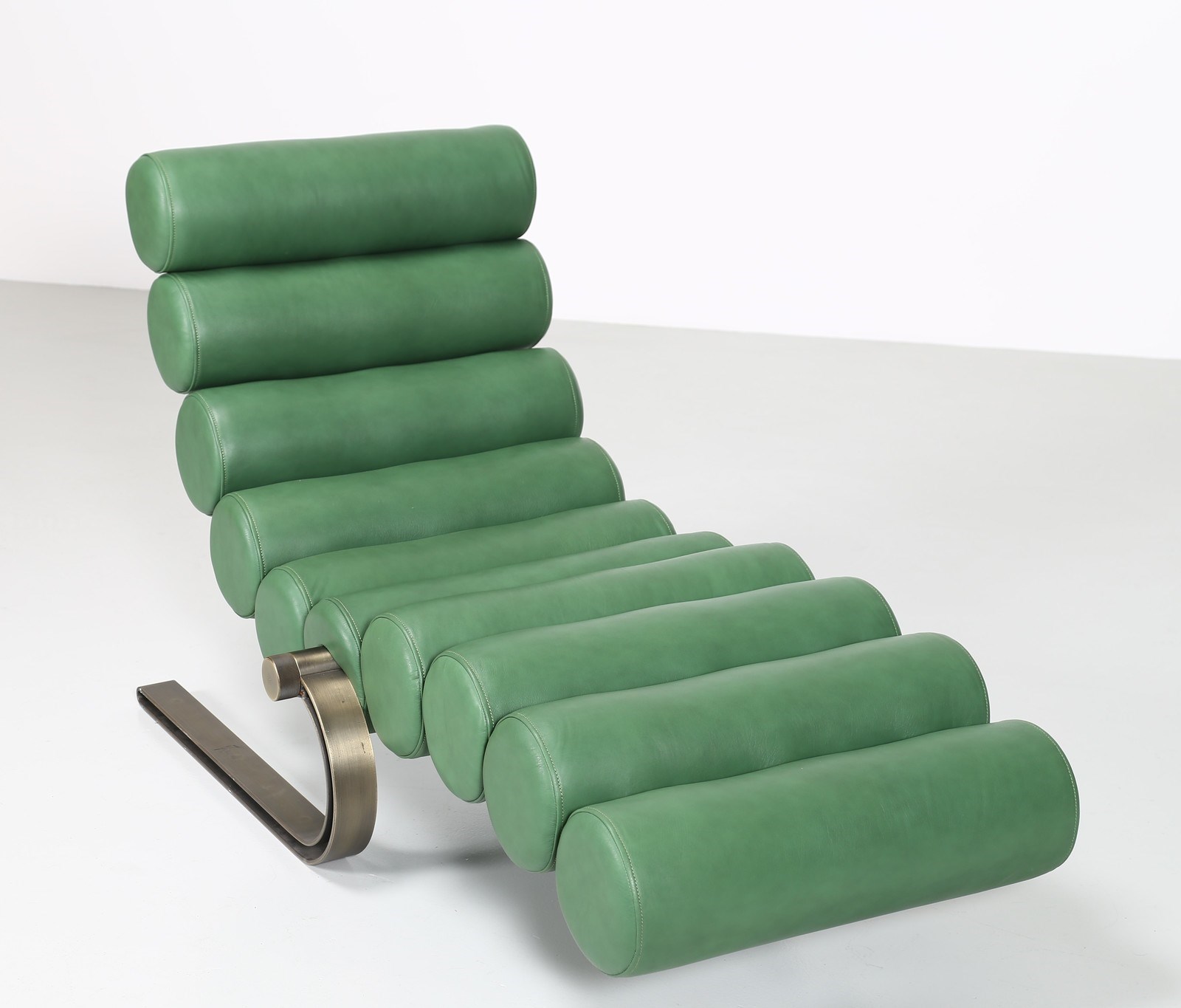 CECCHI MARZIO (1940 - 1990) Rocking chaise longue. Metallo e pelle. Cm 80,00 x 85,00 x 150,00. Chaise longue per Studio MOST, Firenze, 1974. Struttura in metallo spazzolato e rivestimento in pelle. Presente firma Mario Cecchi, numerata 01.