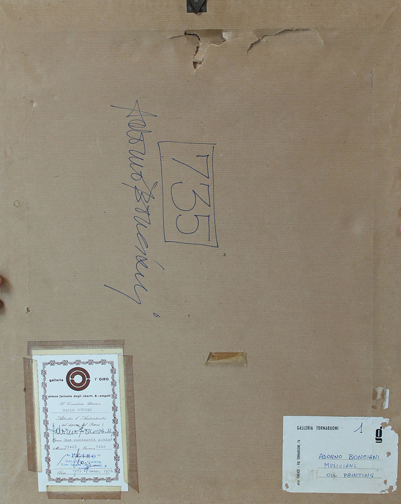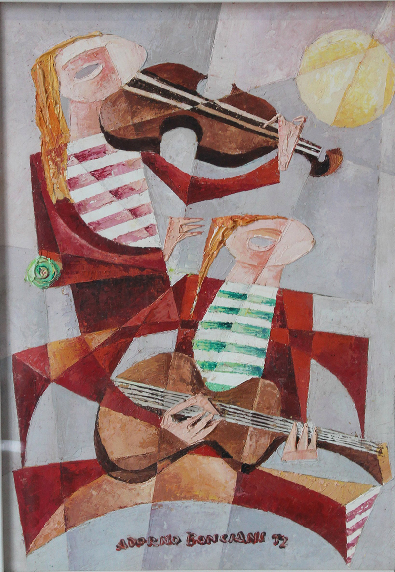 Adorno Bonciani, Due musicanti cubiste, anni 70. Olio, Dimensioni: 32cm x23cm. Certificazione: Firmato fronte e retro opera