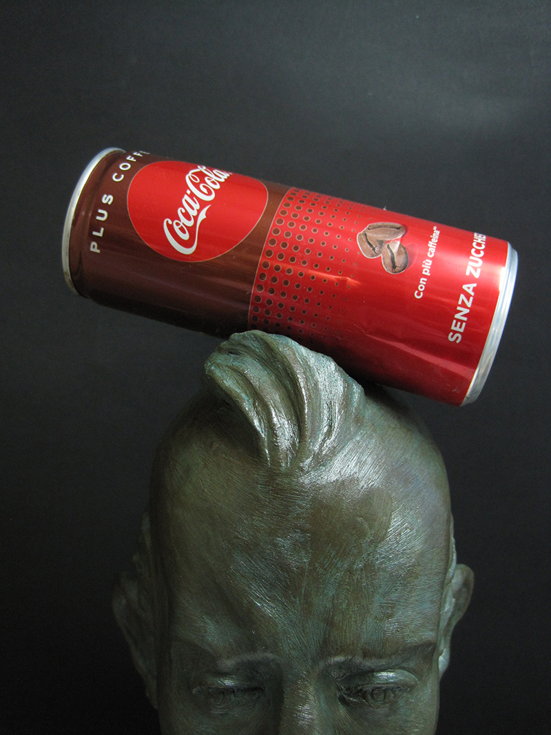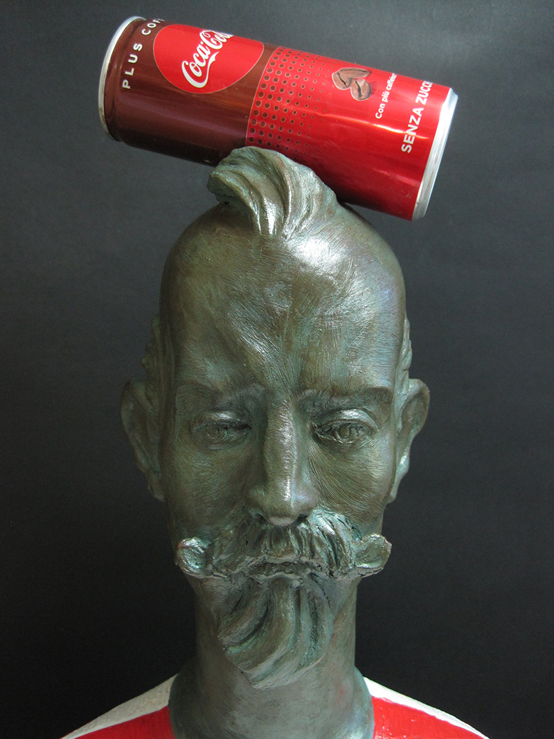 Paolo Camporese, Il sogno di John Pemberton, 2019. Terracotta policroma e lattina di Coca Cola, Dimensioni: 39cm x29cm. Certificazione: Autentica su foto dell'artista