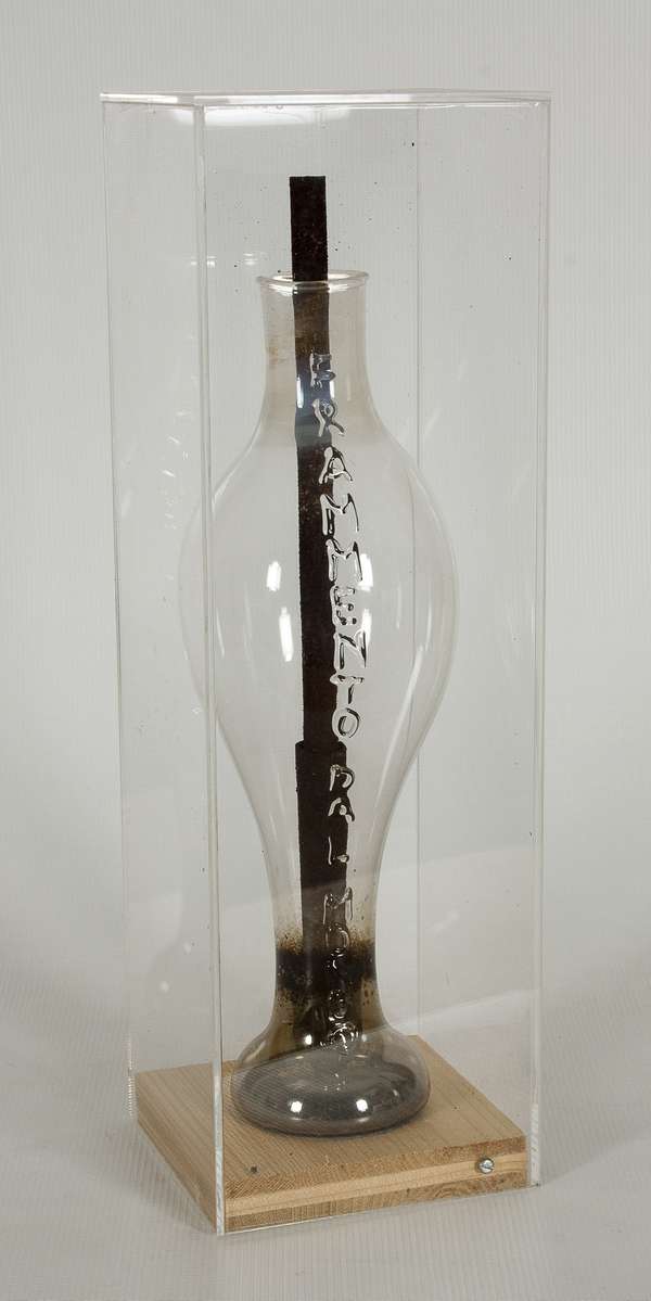 Philip Corner Frammento del mondo, 1976 composizione in vetro e ferro dentro teca in perspex, cm. 37x12x12 Firma sotto il fondo Bibliografia: "Una collezione di piccole sculture del secondo novecento"-Castello Scaligero-Malcesine,2005,pag. 31