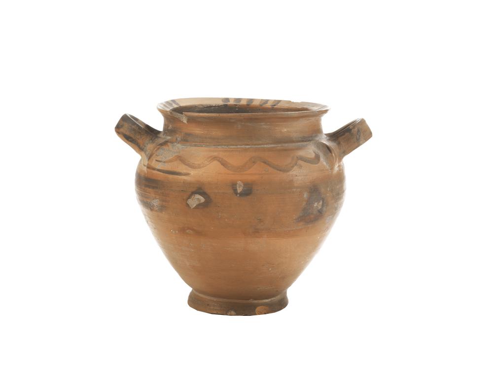 MATERIA E TECNICA: argilla figulina beige, ingubbiatura arancio, vernice bruna, modellato al tornio veloce