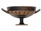 Kylix tipo band-cup, labbro con orlo arrotondato e lievemente estroflesso distinto dalla vasca troncoconica, alto piede a tromba, anse a bastoncello impostate obliquamente sotto al labbro