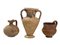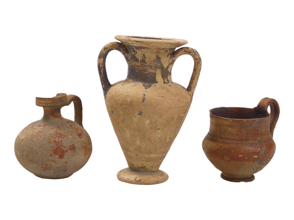 Anforetta a collo distinto, con labbro ad echino e corpo ovoide allungato verso l'alto, piede ad anello, decorata sulla spalla con raggiera di triangoli, superficie abrasa; brocchetta con orlo a colletto e corpo globulare schiacciato, lagynos con orlo verticale corpo globulare ed ansa a bastoncello (3)