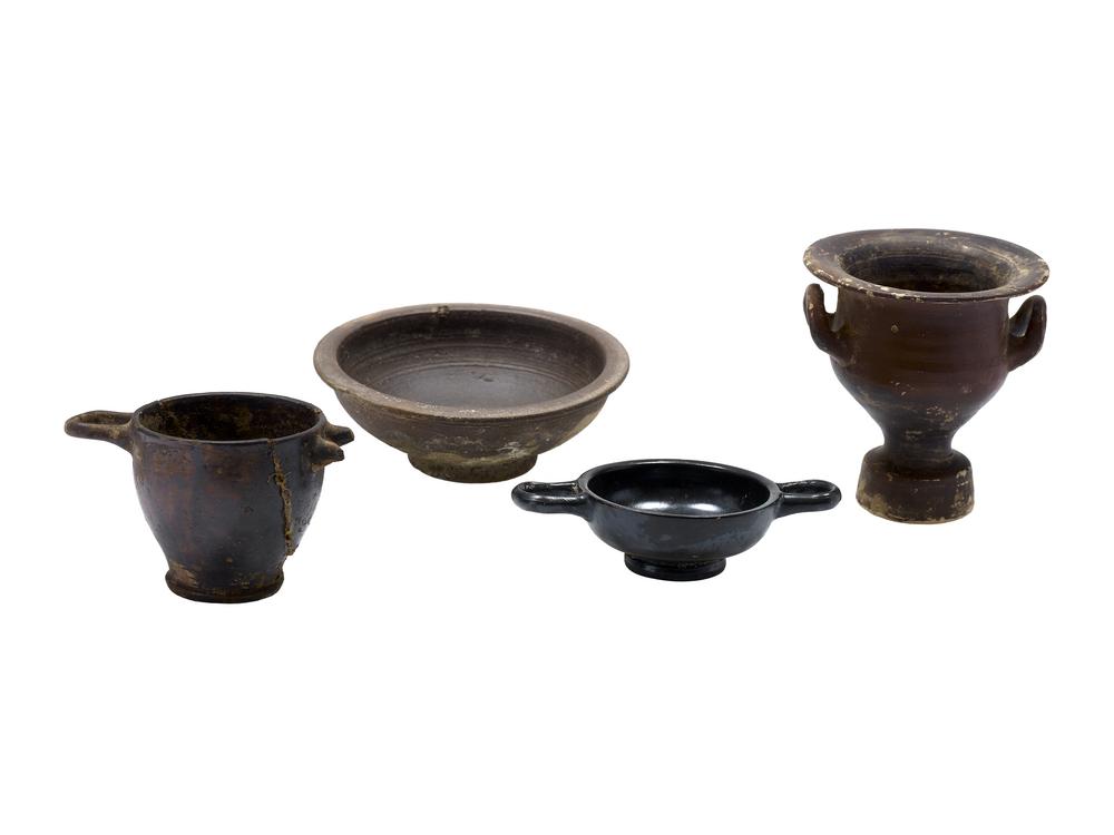 Piccolo cratere a campana con orlo fortemente aggettante, alto piede cilindrico modanato ed anse a bastoncello ritorte verso l'alto; coppa con vasca troncoconica molto profonda e piede a disco; skyphos con orlo arrotondato, anse orizzontali e piede ad anello; coppetta biansata con orlo arrotondato, anse orizzontali a bastoncello e piede troncoconico (4)