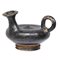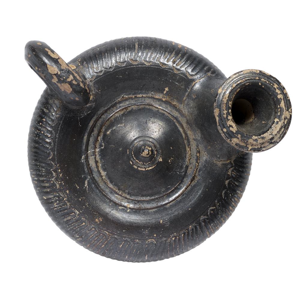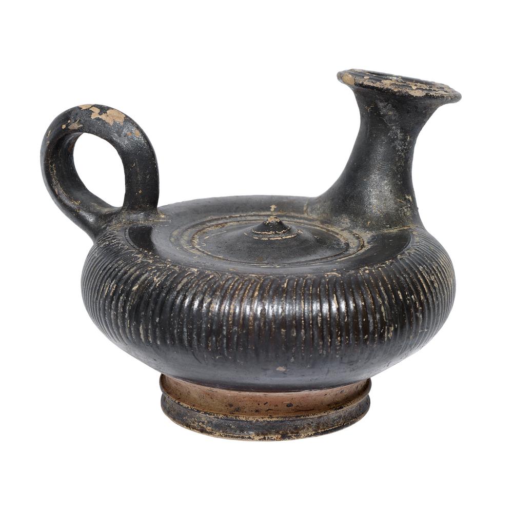 Guttus con alto piede cilindrico sagomato, serbatoio globulare schiacciato decorato da sottili striature verticali, alto bocchello lievemente obliquo con orlo estroflesso scanalato, ansa ad anello verticale, sul serbatoio apofisi conica