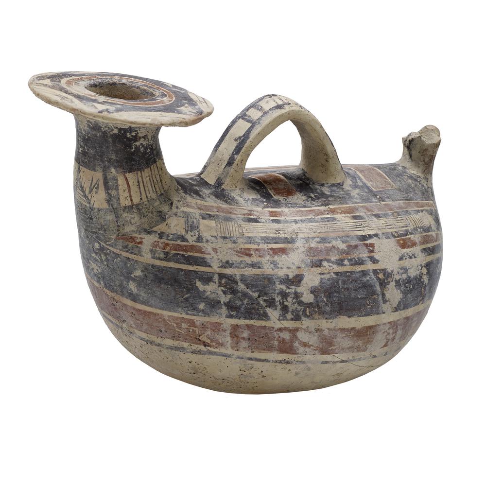 Askos con ampio bocchello a tesa appiattita, collo troncoconico, corpo globulare schiacciato, ansa a nastro impostata longitudinalmente sul dorso, all'estremità opposta al bocchello protome ferina stilizzata; fondo piatto; sul bocchello archi di cerchio tangenti l'imboccatura, sul collo motivo geometrico e filetti verticali, sul ventre fasce alternate in bruno e paonazzo e motivi geometrici