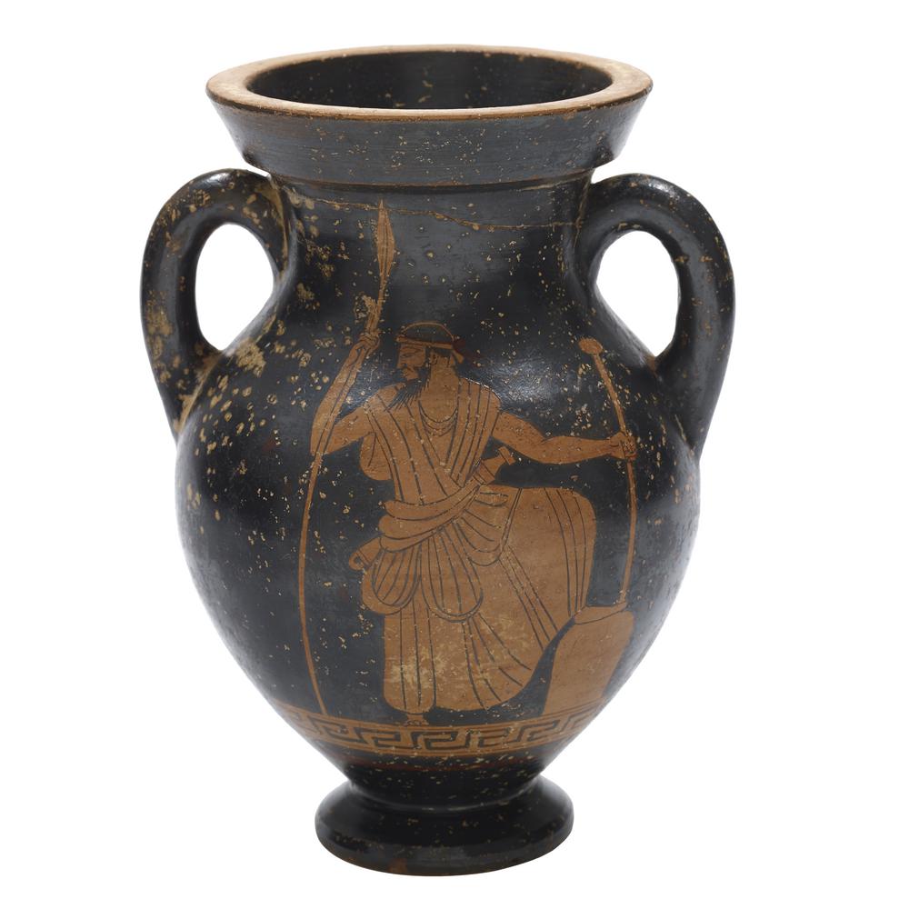 DECORAZIONE: su un lato figura maschile barbata avvolta nel mantello, volta a destra con una lancia in una mano ed un bastone nell'altra; sull'altro lato figura di efebo nudo gradiente a sinistra con le braccia protese ed una tenia nei capelli col mantello drappeggiato sulle spalle