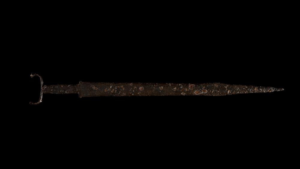 Grande spada con impugnatura caratterizzata da due brevi antenne e lunga lama triangolare costolata