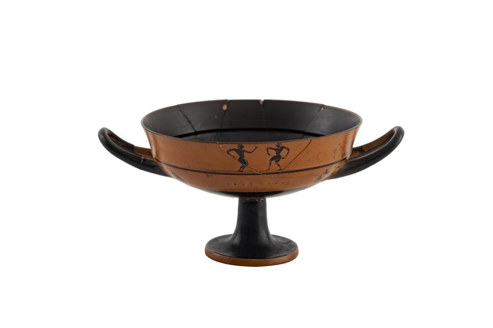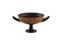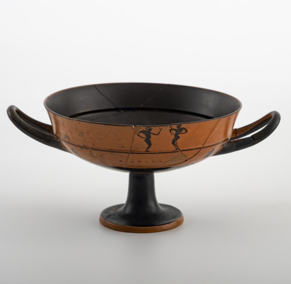 DECORAZIONE: all'esterno su entrambi i lati sul labbro coppia di danzatori nudi e affrontati, sulla vasca falsa iscrizione; all'interno tondo risparmiato con gorgoneion