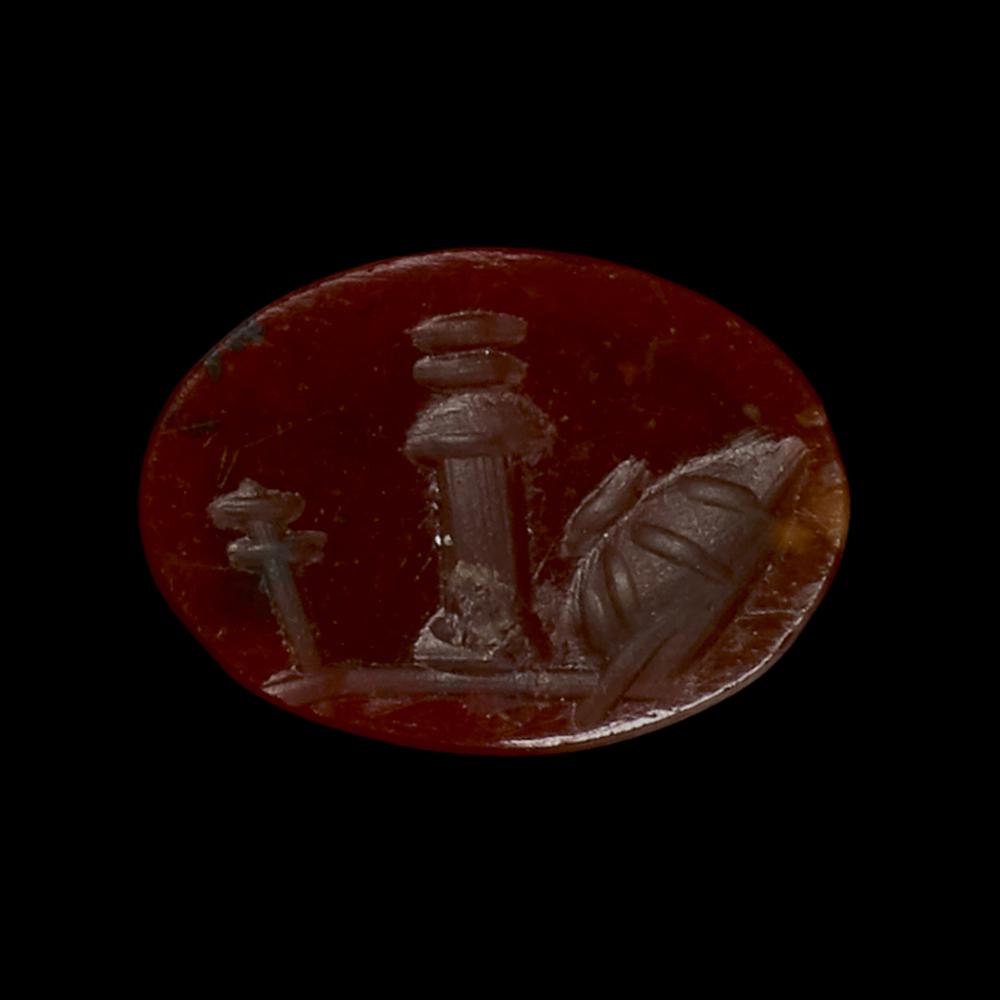Castone ellittico inciso con pilastrino al centro, bastone a sinistra e coppa baccellata rovesciata a destra