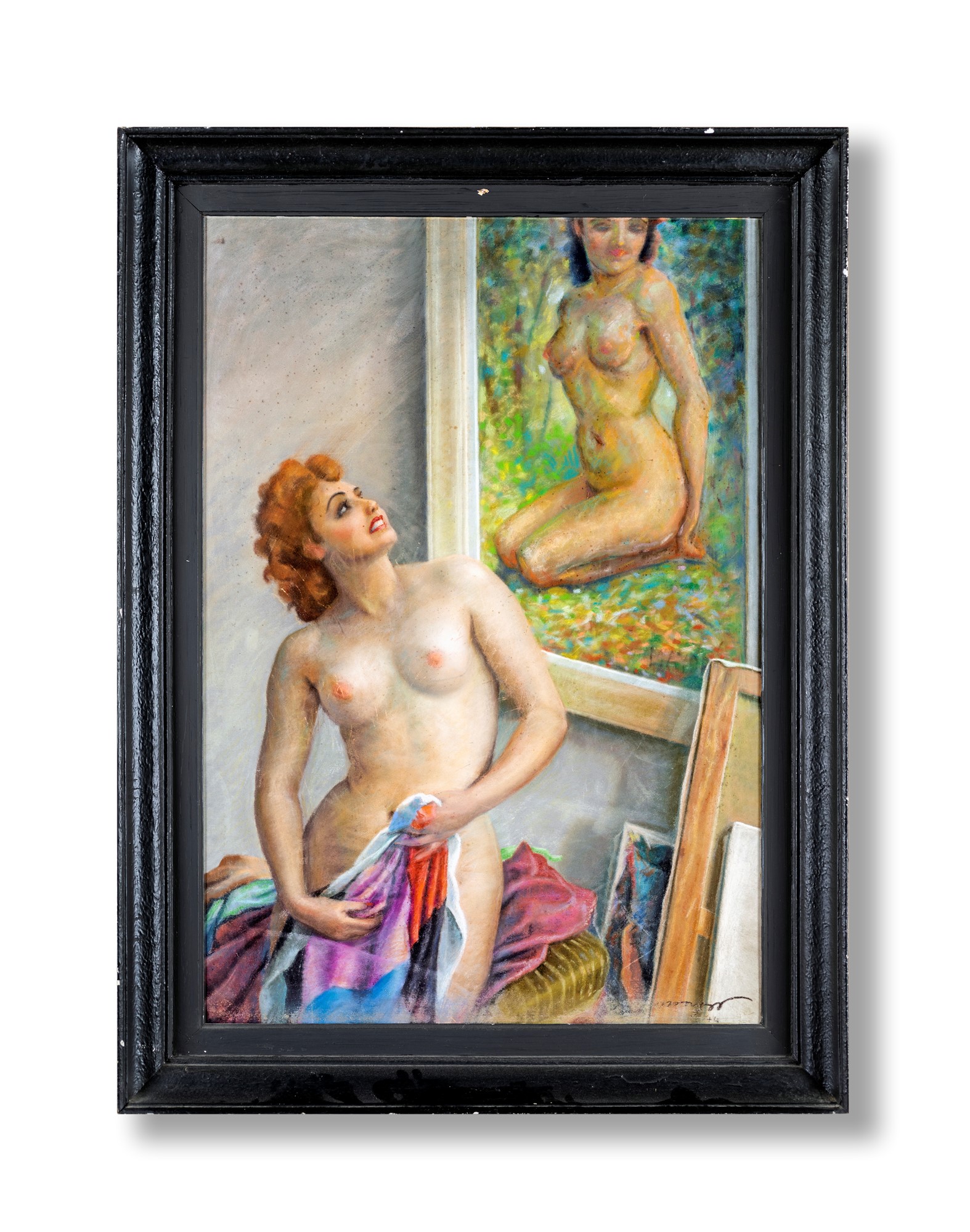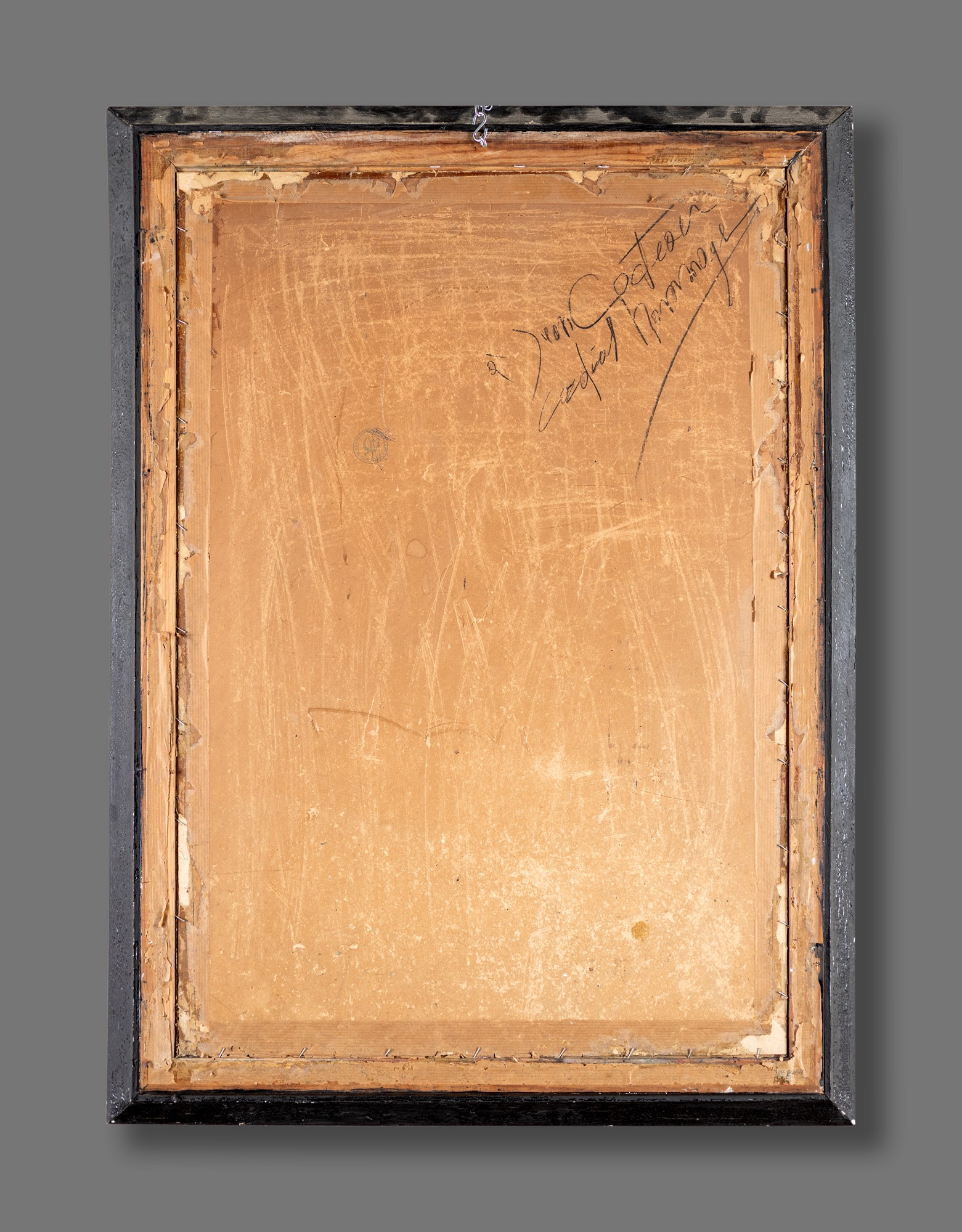 Scena di interno - In basso sul fronte firma non decifrata. Al verso reca "A Jean Cocteau, Cordial Hommage". - cm 100x70 - Pastello su cartone