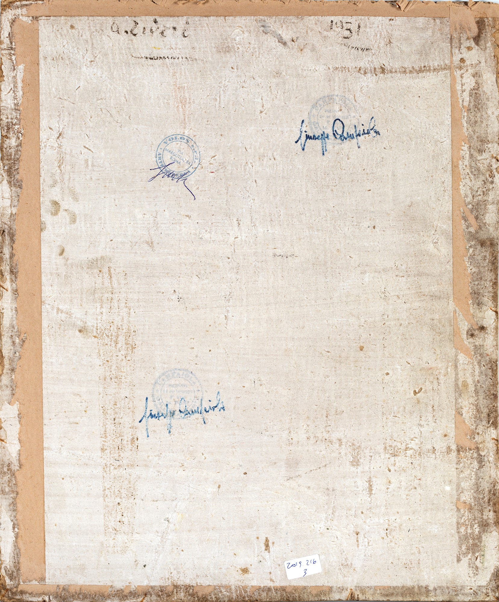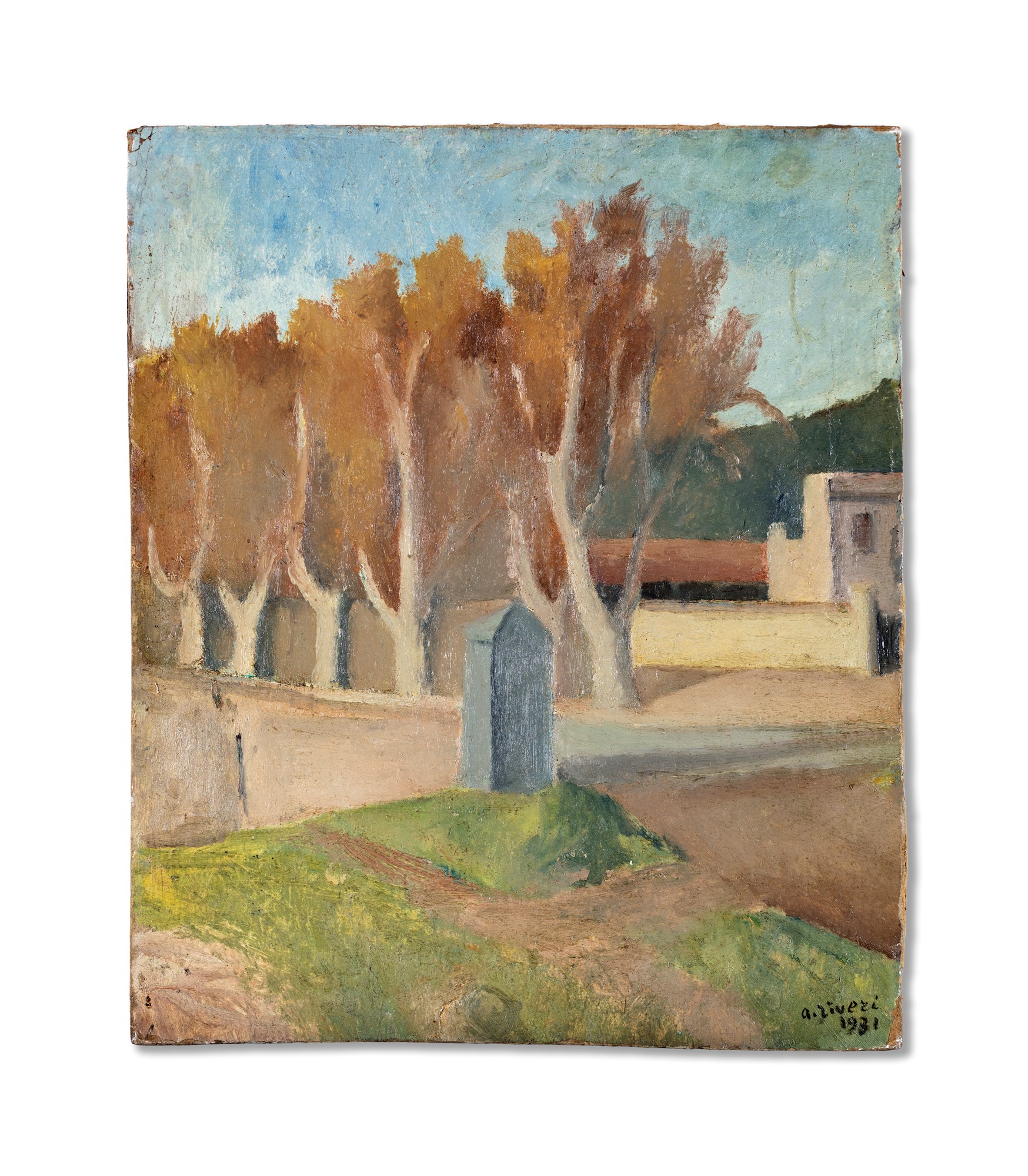 Alberto Ziveri Veduta di roma - Firma e data sul fronte in basso "A. Ziveri 1931". Al verso reca timbri della Galleria Volos (Roma) e della Galleria Campaiola (Roma). - 37,5x47,5 - Olio su tavola - 1931