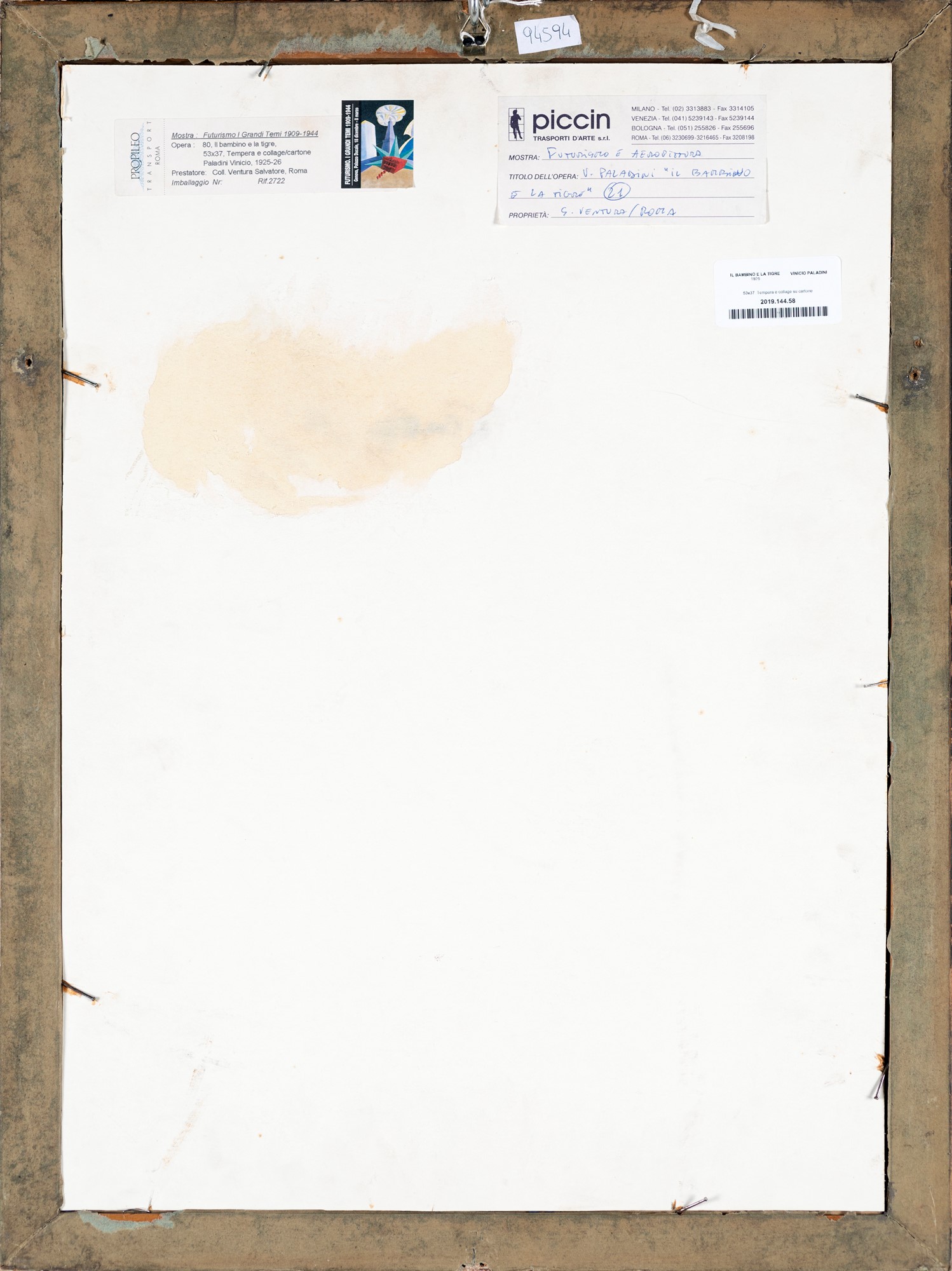 Etichette al retro della mostra “Futurismo. I grandi temi 1909-1944”, Palazzo Ducale, Genova, 1998 e della mostra “Futurismo e Aeropintura. Artem em Itàlia 1909,1944”,Palàcio des Galveias, Lisbona, 1999 - 53x37 - Tempera e collage su cartone - 1925