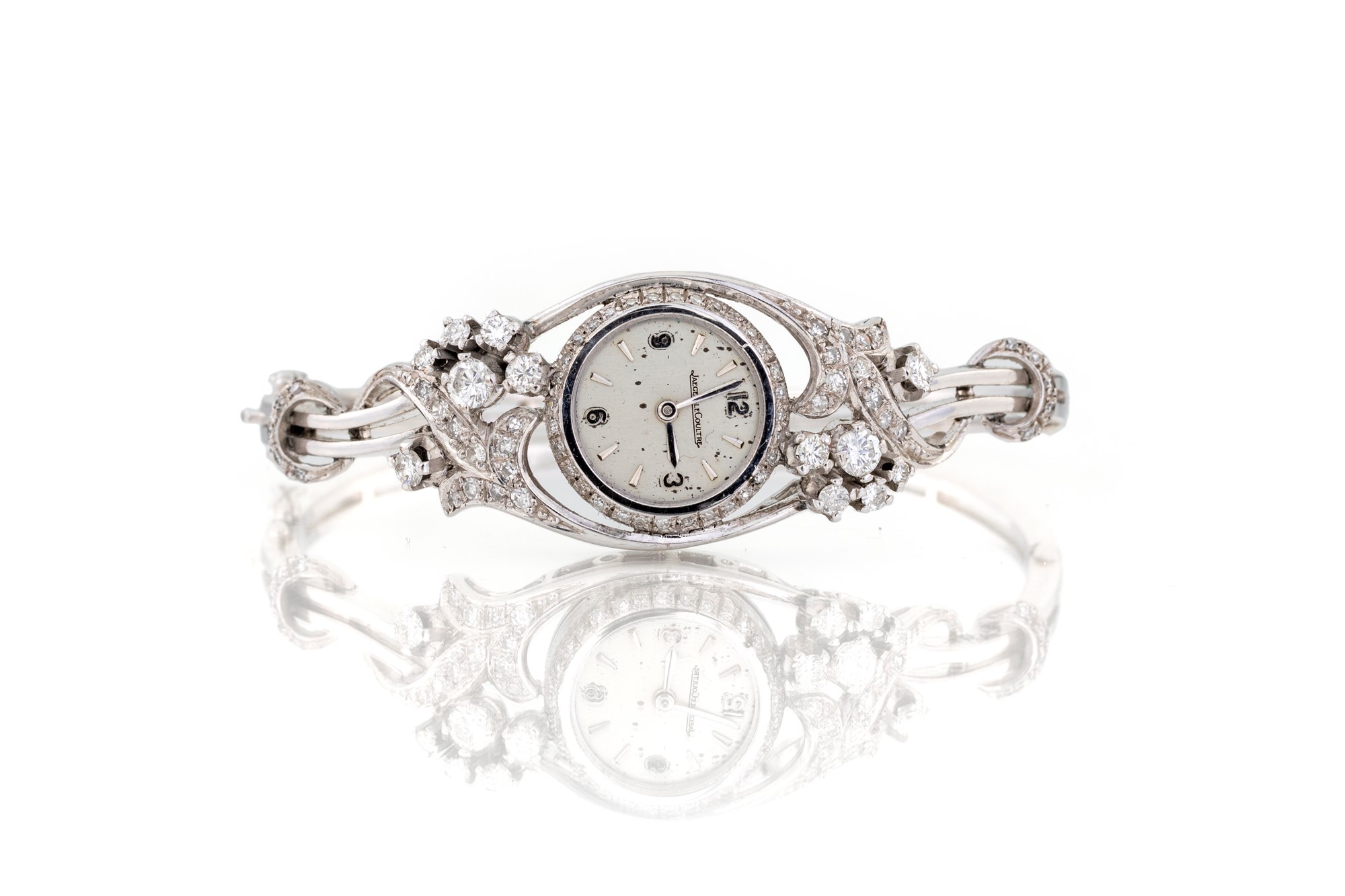 OROLOGIO JAEGER LE COULTRE DA SERA - oro bianco 750/000, diamanti, g 26,50; manca il vetro, da revisionare