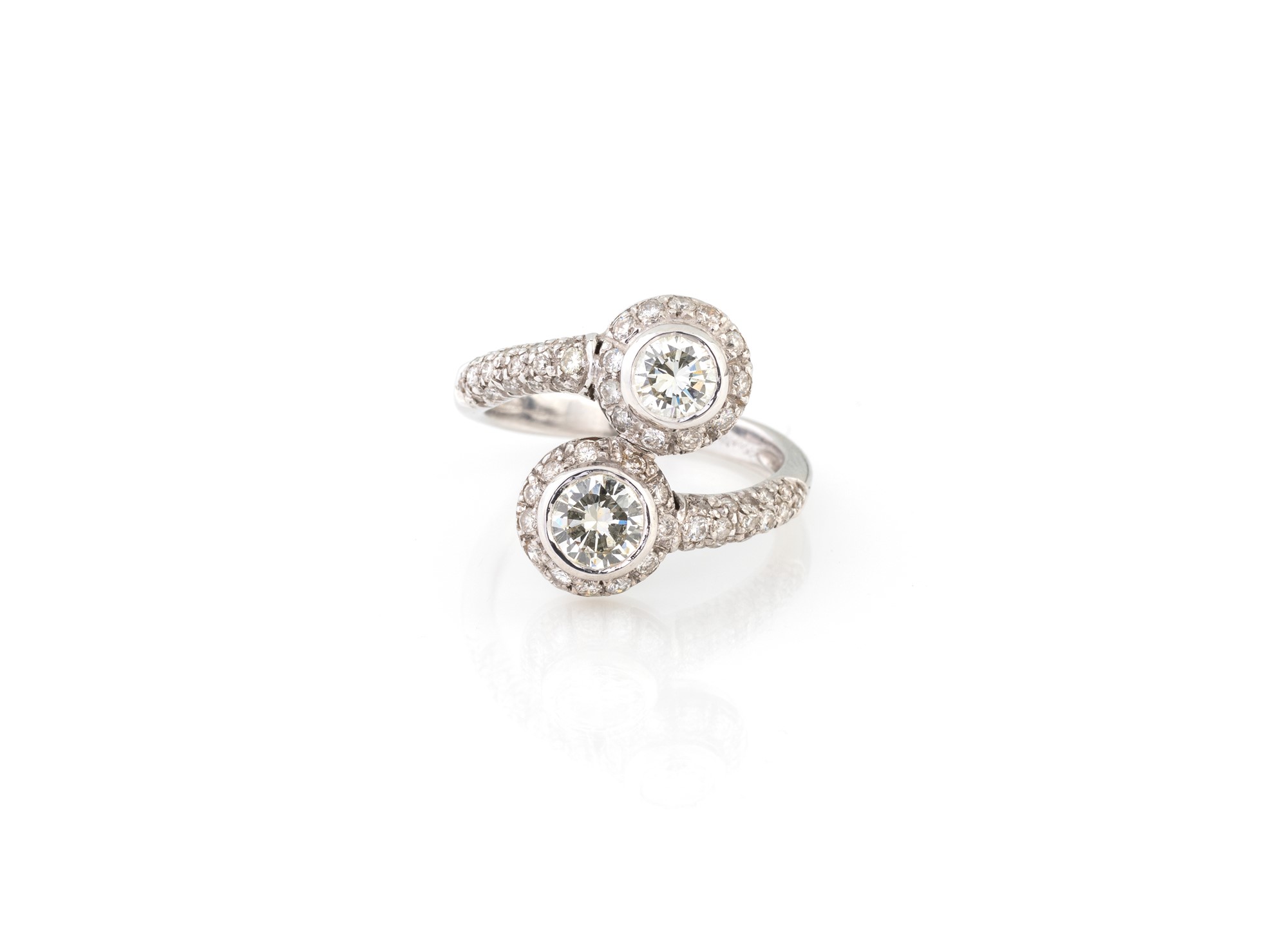 ANELLO CON BRILLANTI - realizzato in oro bianco 750/000 con due brillanti contrariè di ct 0,80 e ct 0,65 circa, contornato da brillanti ct 0,45, misura 22
