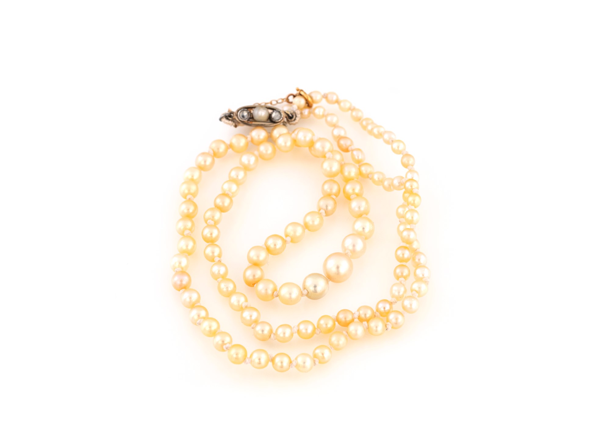 PERLE NATURALI - in gradazione con 108 perle color crema, chiusura antica in oro e diamanti taglio a rosa, cm 44. Expertise gemmologico con RX del 12-09-2018