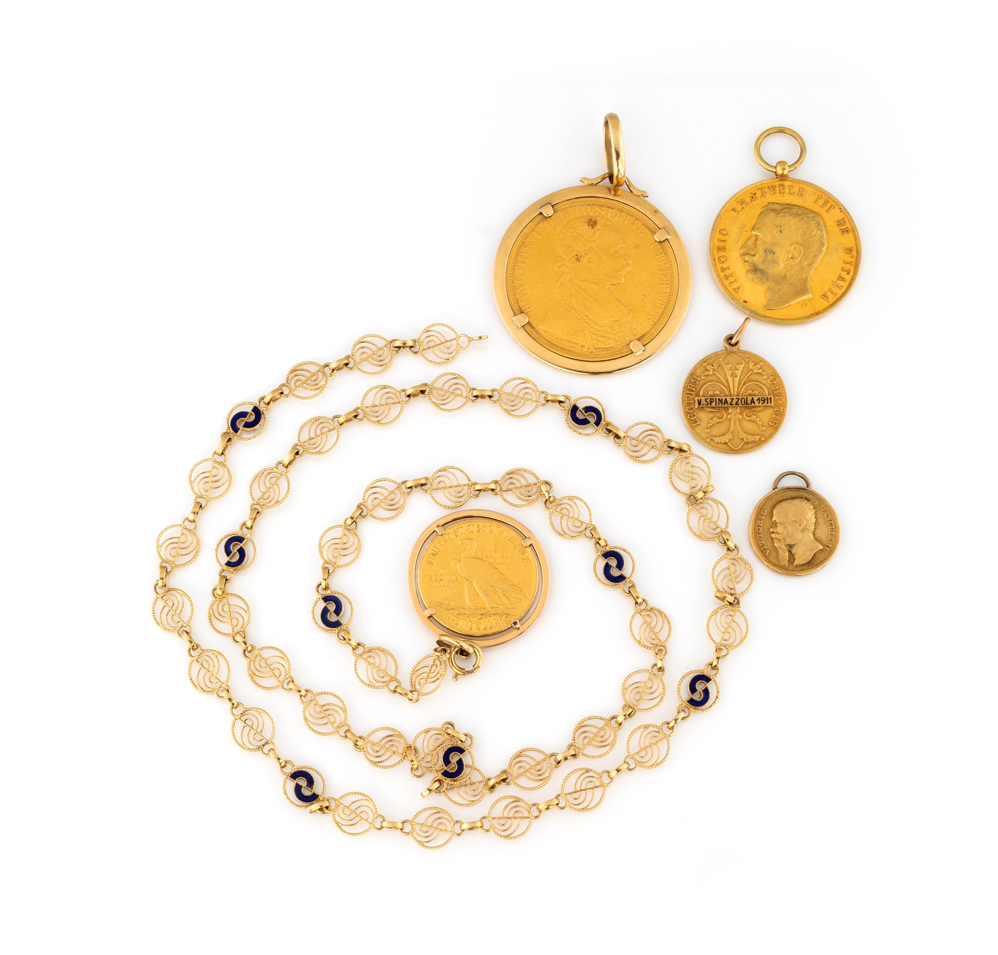MONETE E MEDAGLIE IN ORO - 10 dollari 1915 titolo 900, con catena in oro 750/000, 4 ducati Francesco Giuseppe titolo 986, su cornice in oro 750/000, medaglia in oro ministero d'istruzione pubblica, medaglia in oro camera dei deputati, medaglia commemorati