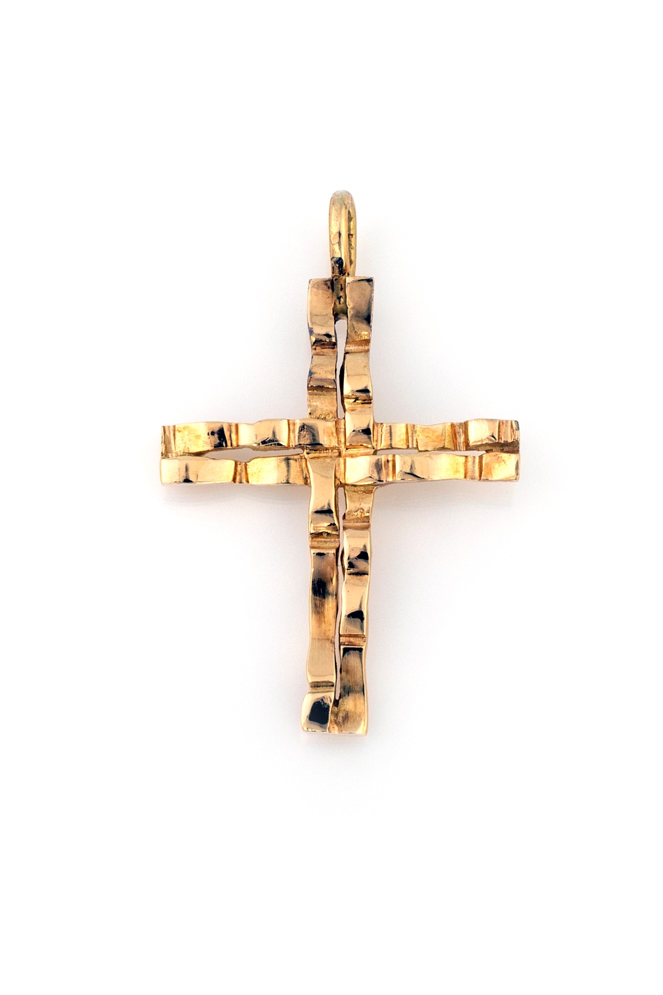 CROCE LIGNEA - eseguita a mano in oro giallo 750/000, con lastra sbalzata a raffigurare il Cristo.