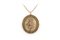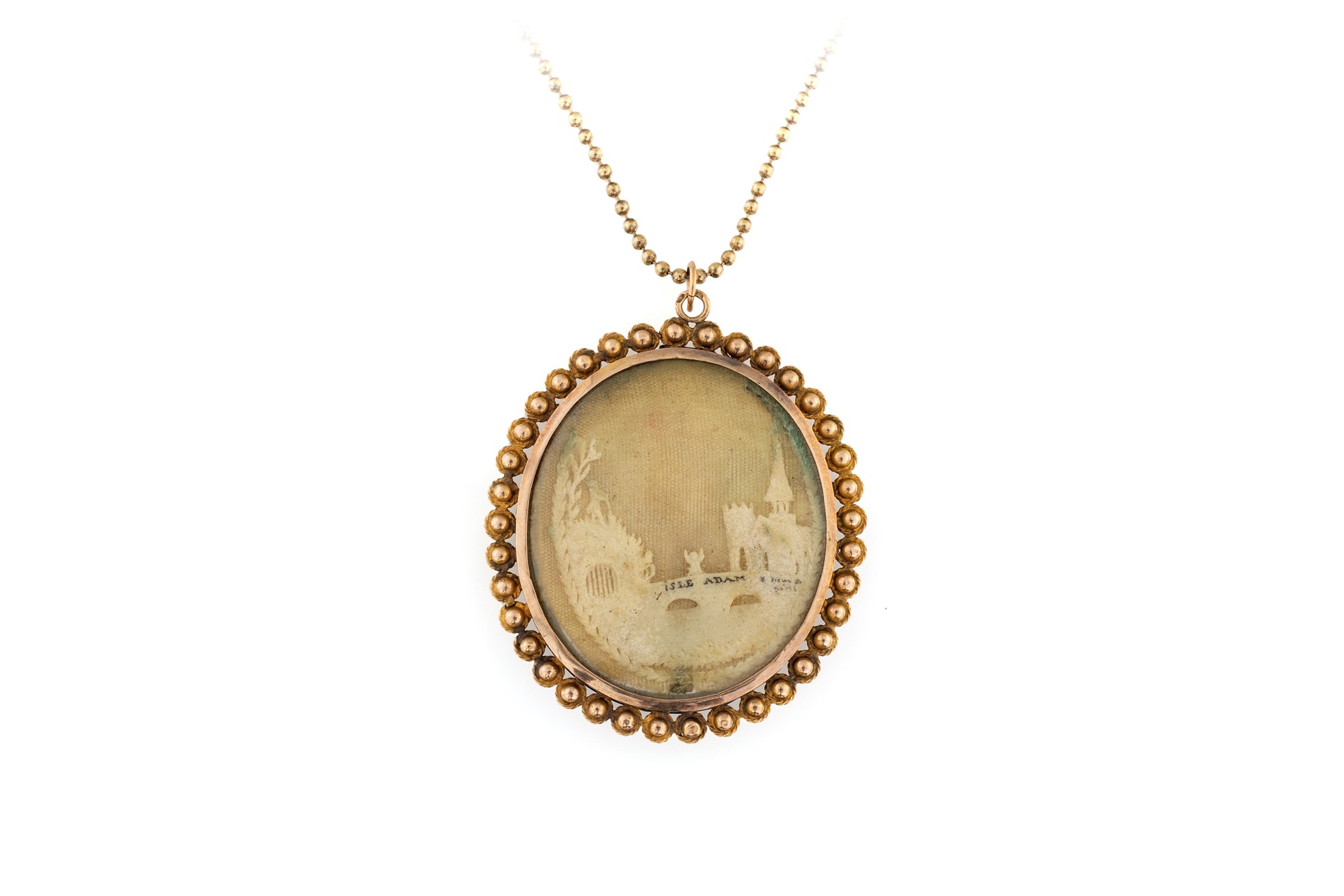 CIONDOLO VITTORIANO IN ORO - miniatura interna di fiori in tessuto, nel retro miniatura Isle Adam-Francia, catena in argento dorato.