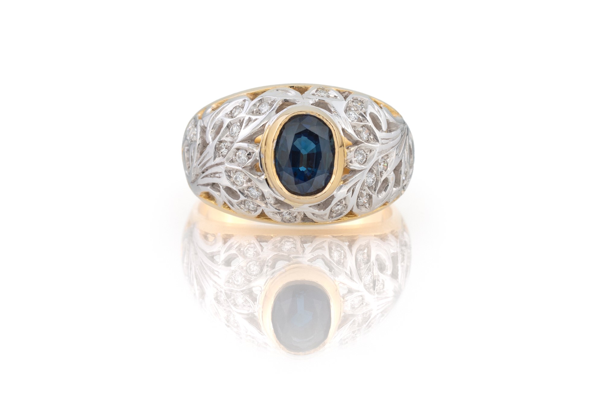 ANELLO CON ZAFFIRO AUSTRALIANO - taglio ovale ct 1,14, brillanti ct 0,23, montatura 18 kt con traforo inciso su oro bianco, g 9,40
