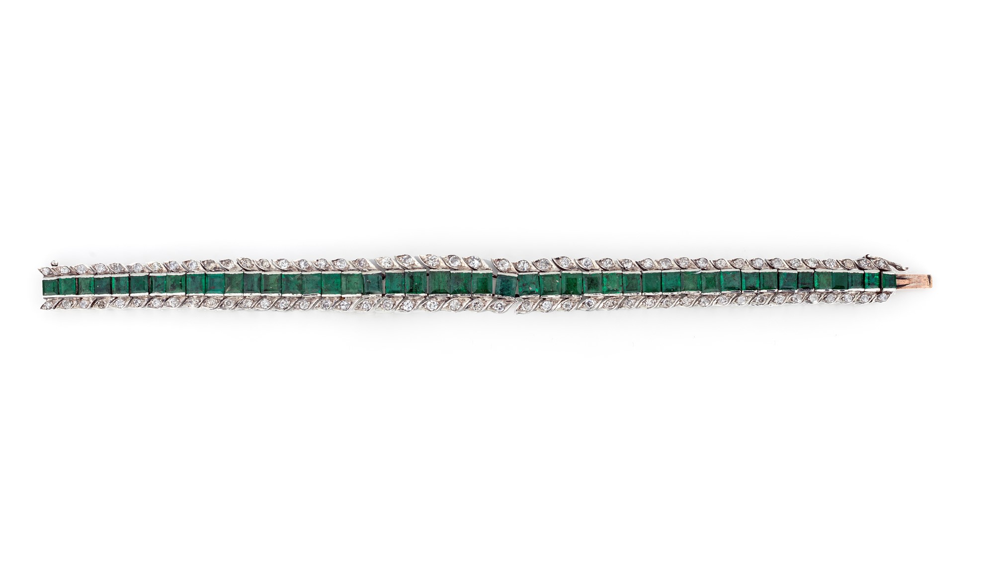 BRACCIALE DI SMERALDI - con 44 pietre ct 16,00 circa, impreziosito con 90 brillanti ct 1,80, platino g 32