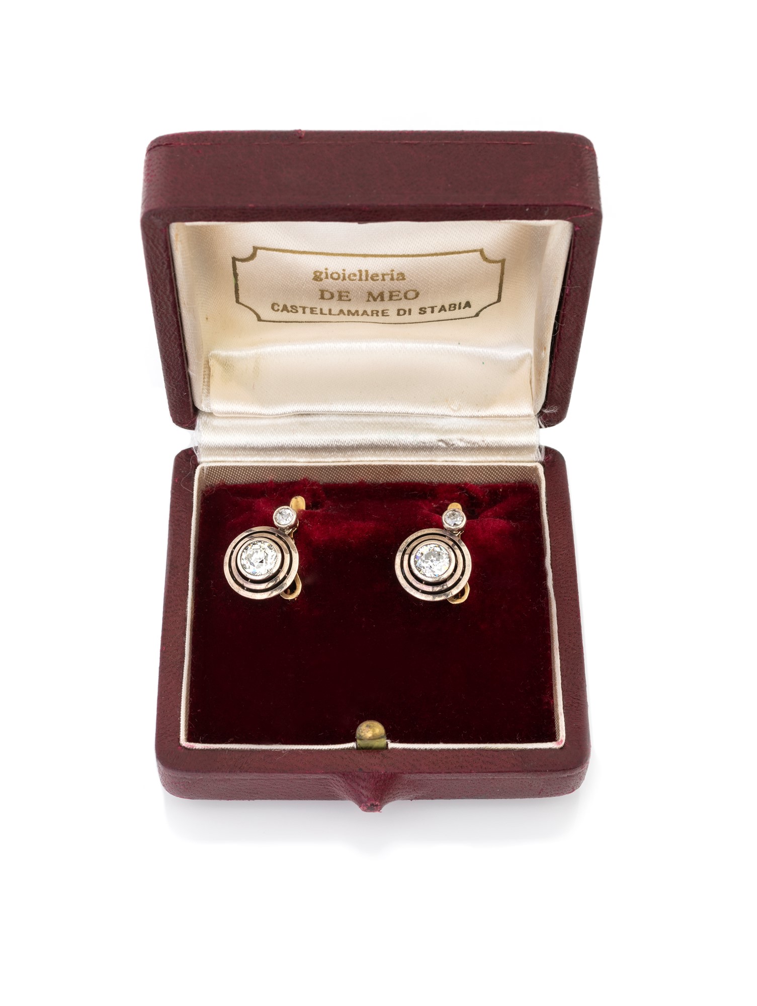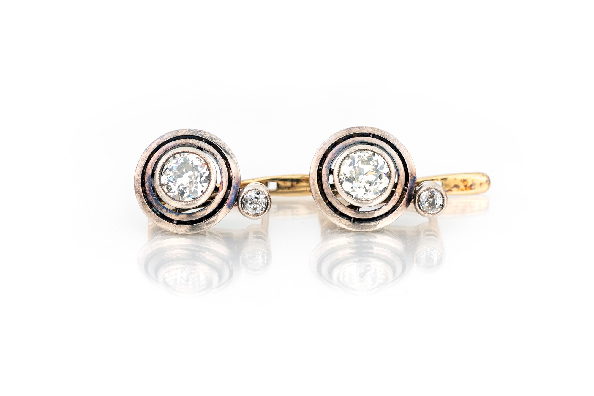 ORECCHINI CON DIAMANTI - taglio antico di ct 1,80/1,90 totali circa, colore G-Vs/Si, in oro giallo 750/000 e chiusura a monachella, g 6,30.