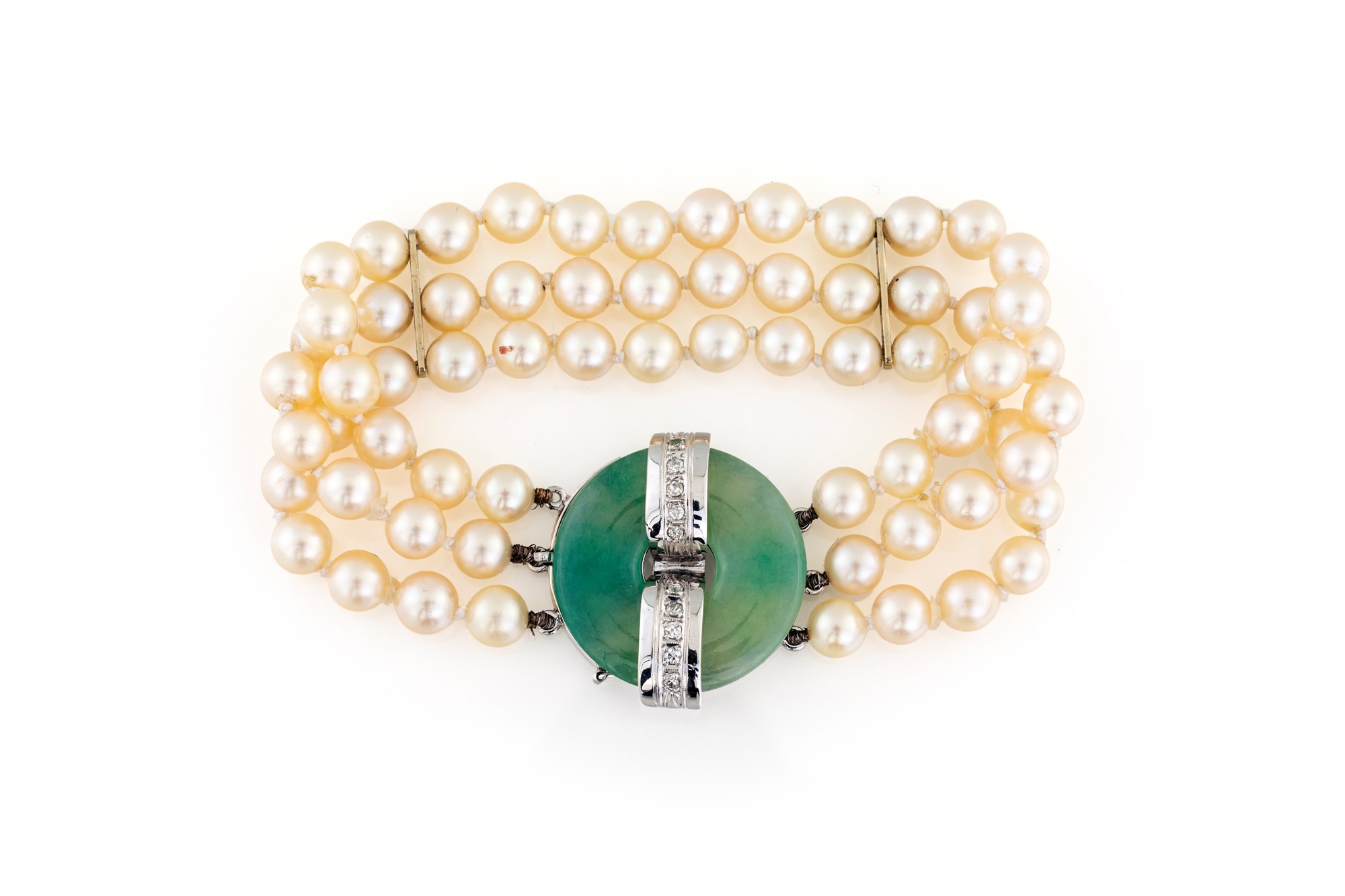 BRACCIALE DI PERLE CON GIADA - 4 fili di perle mm 6,00, broche con anello in giada, oro 750/000, brillanti huit huit.