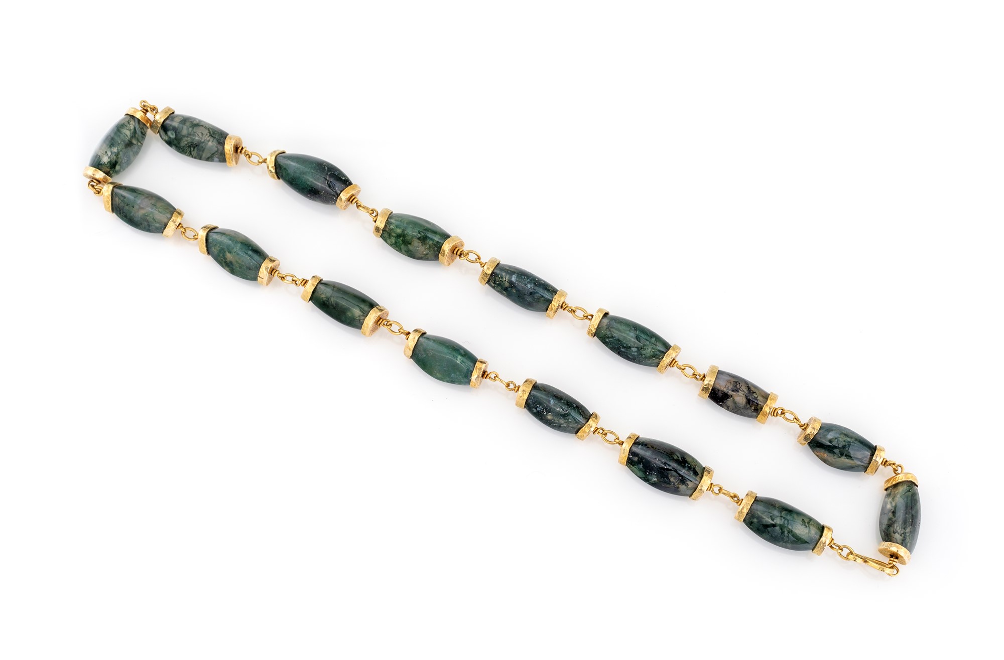 COLLANA CON PIETRE VERDI - intercalari in oro giallo 750/000 con lavorazione battuta, g 102