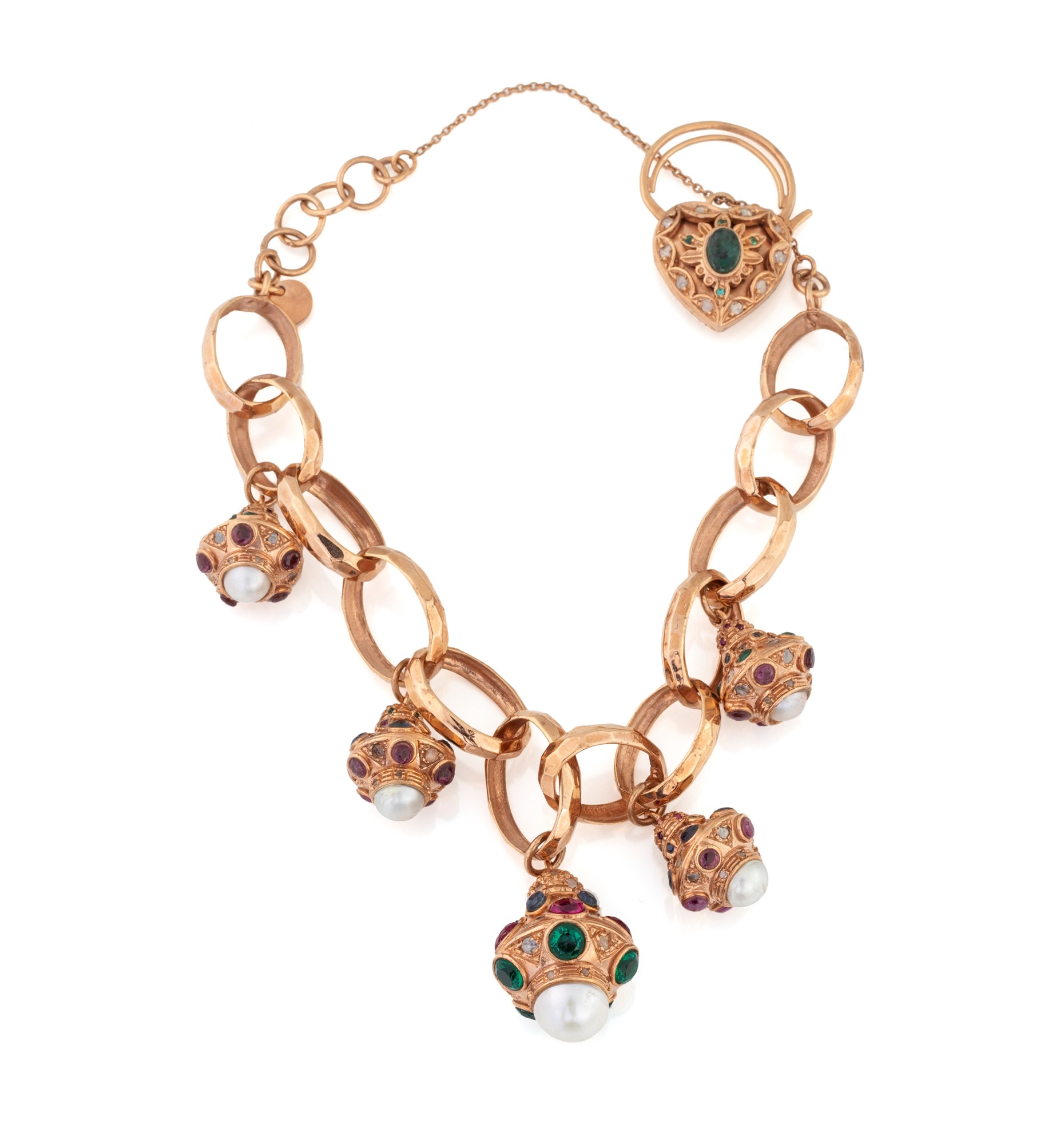 BRACCIALE CHARMS - in argento 925 rodiato rosa con 6 ciondoli impreziositi da mezze perle, rubini e zaffiri. Nel ciondolo centrale di maggior dimensione le pietre sono di sintesi, g 35