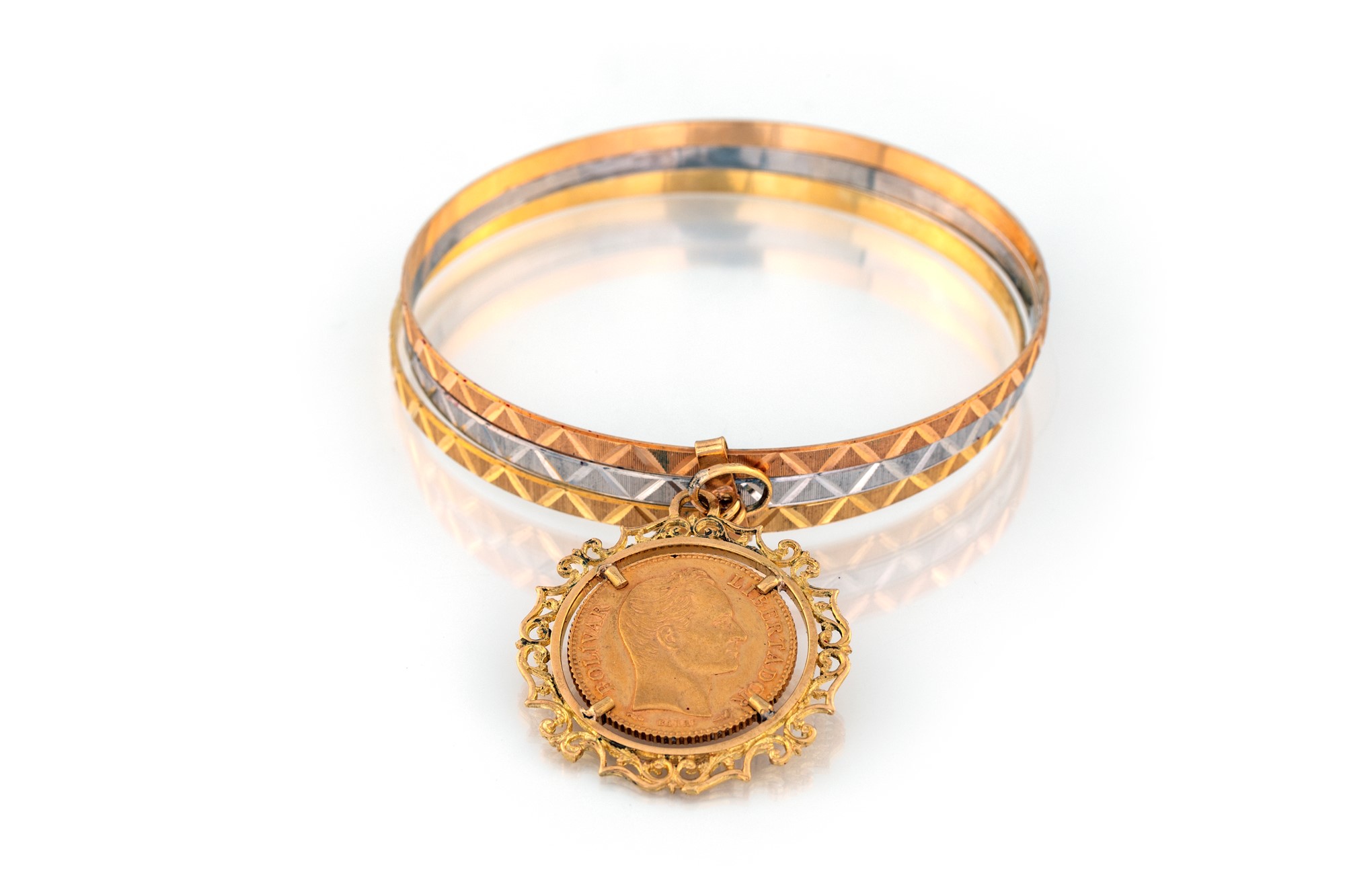 BRACCIALE TRE COLORI CON MONETA VENEZUELANA - in oro giallo 750/000 e moneta 900/000, g 32,40